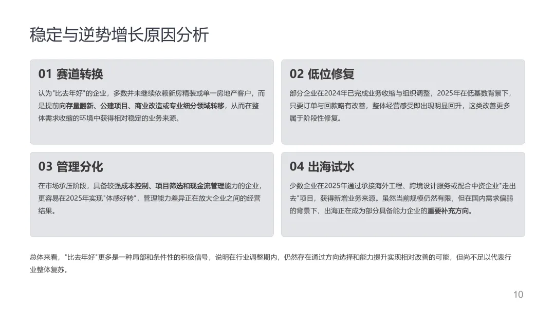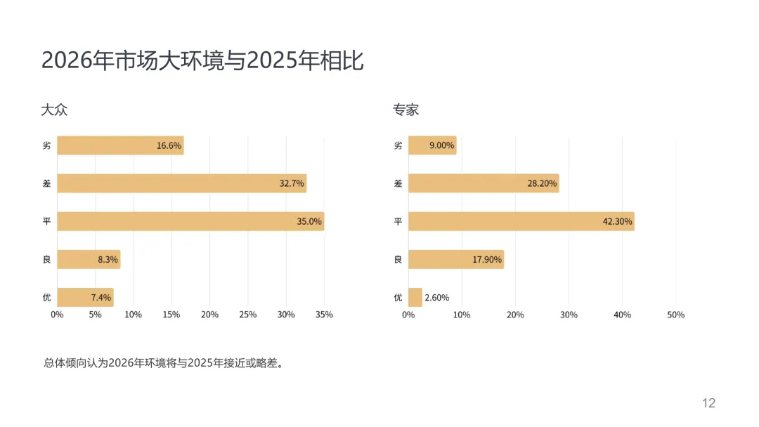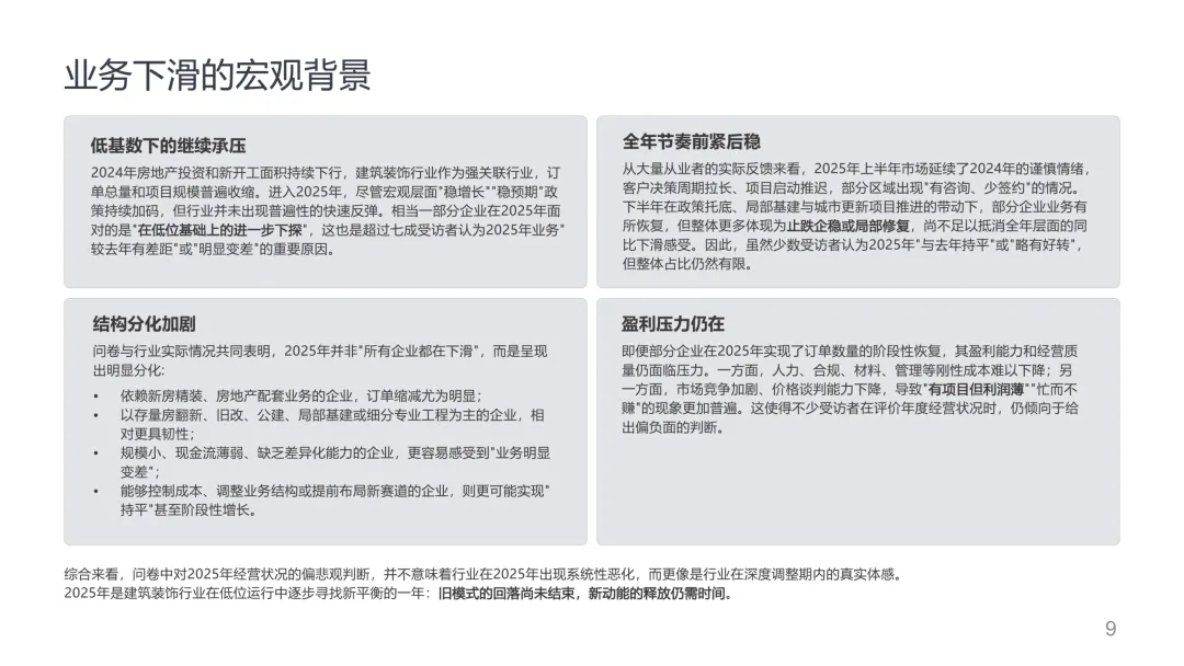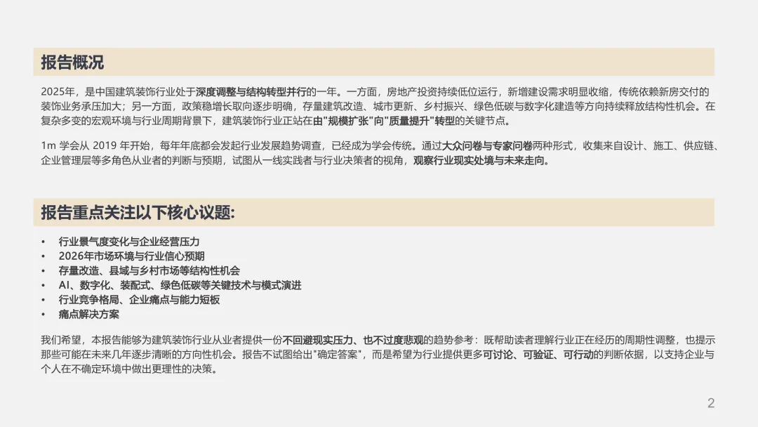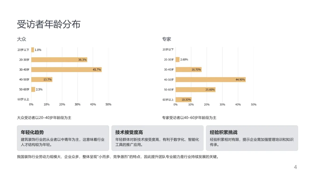 建筑装饰行业正面临深刻调整与结构转型的双重压力。房地产投资持续低迷,新增建设需求减少,传统依赖新房交付的装饰业务承受较大压力。政策导向明确,存量建筑改造、城市更新、乡村振兴、绿色低碳及数字化建造等方向逐步释放结构性机会。行业正处于从“规模扩张”向“质量提升”转变的关键阶段。报告基于从业者和专家的调研及公开资料,分析行业现状、痛点及应对策略。调查覆盖设计、施工、供应链及企业管理层等多个角色,旨在从一线实践者和决策者的角度,观察行业当前处境与未来趋势。核心议题包括:行业景气度变化、2026年市场环境预期、存量改造与县域乡村市场的机会、AI、数字化、装配式及绿色低碳技术的发展、行业竞争格局与企业短板,以及相关解决方案。受访者年龄分布显示,大众受访者集中在20至40岁,年轻化趋势明显,技术接受度高,但经验积累相对不足,企业需加强培训与知识传承。专家受访者多在40至60岁之间,主要集中在一线城市,反映出行业核心资源与信息仍高度集中于这些区域。行业整体呈现“小而多”的特点,劳动力规模庞大,竞争激烈,提升团队专业能力是行业持续发展的关键。地区分布上,大众受访者分布较广,涵盖经济发达地区及中部、东北等传统建筑大省,而专家则更多聚集于一线核心城市。