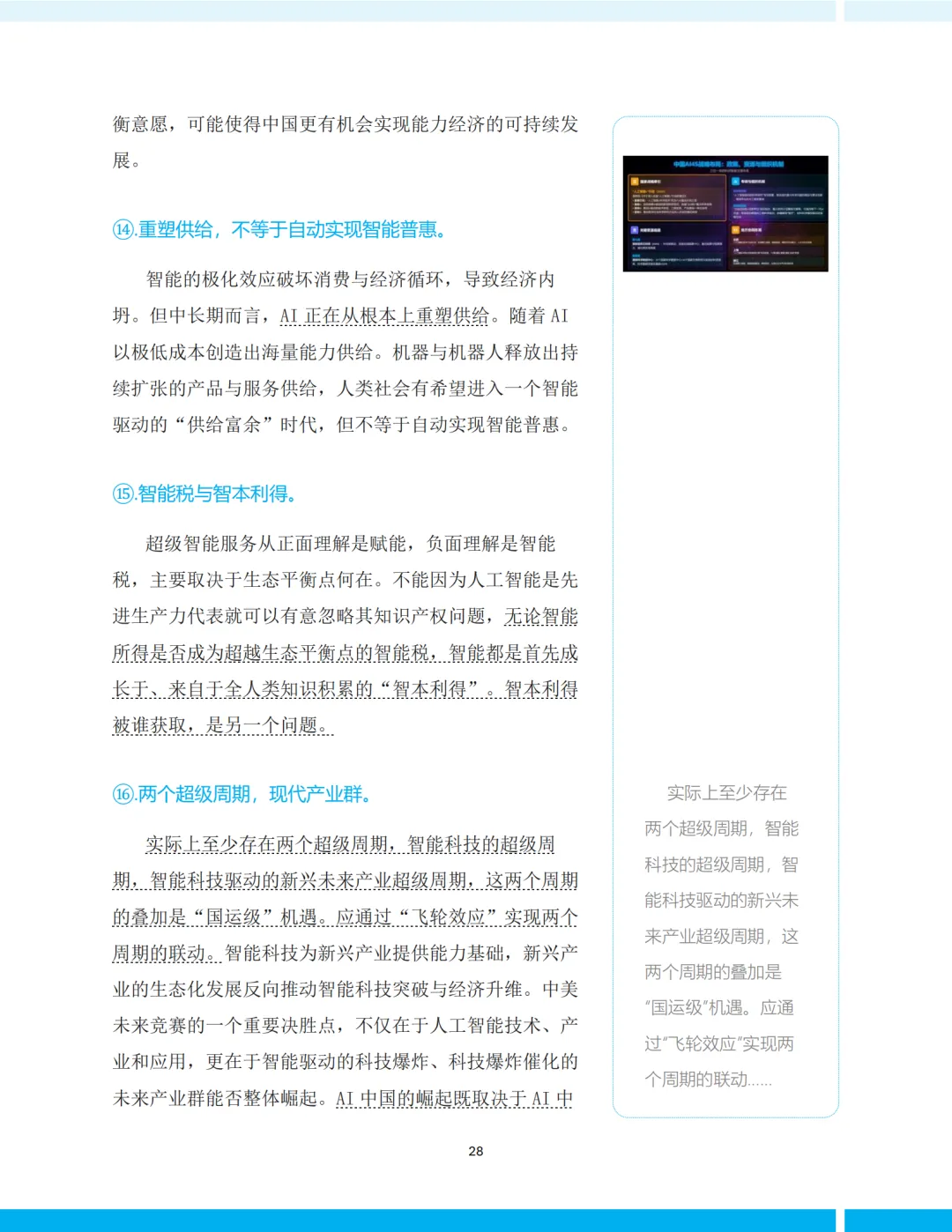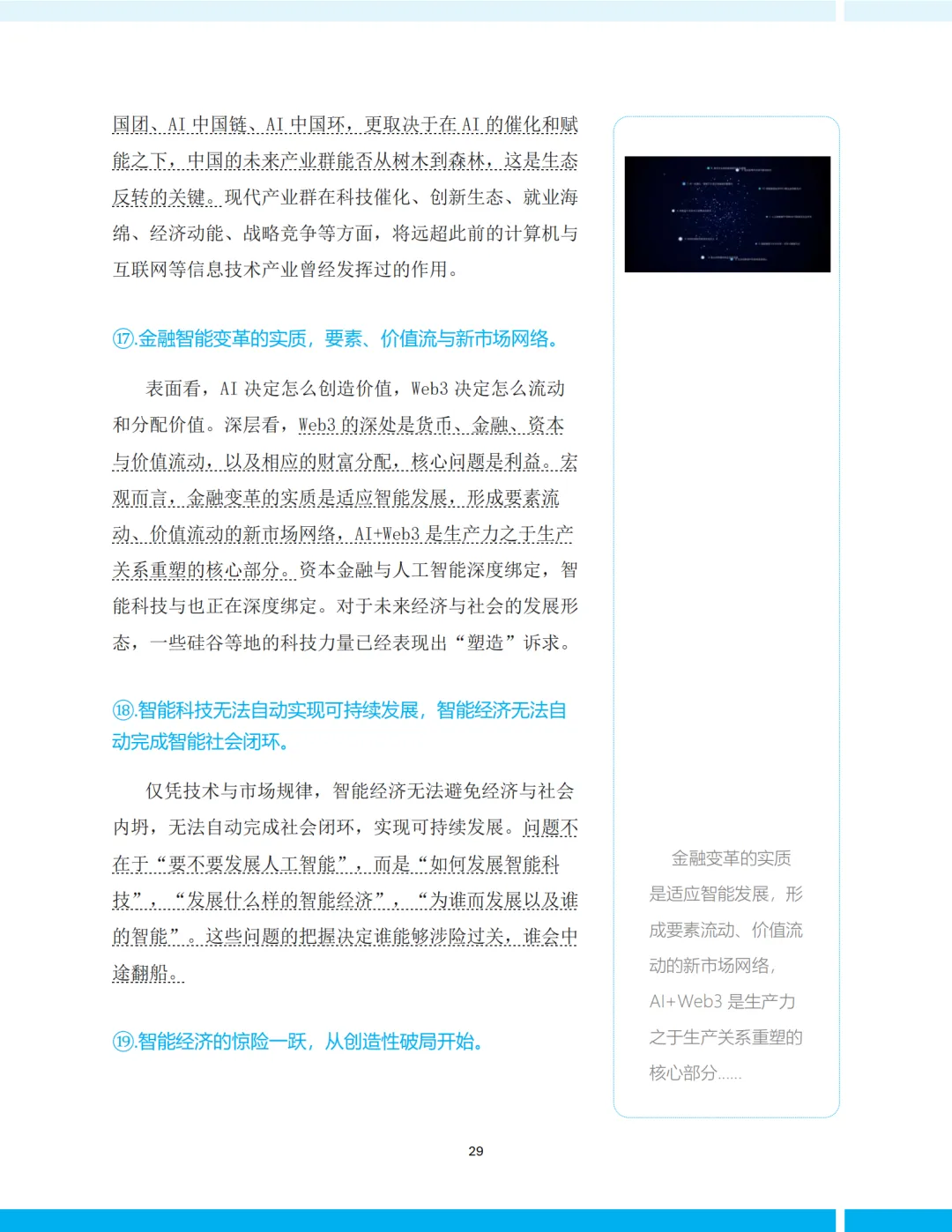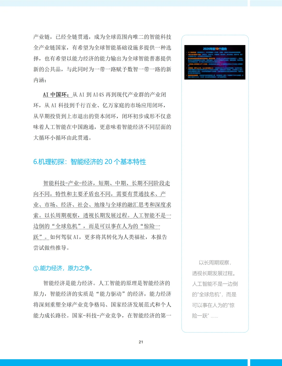 《报告》提炼出智能经济的20个基本特性,涵盖技术、产业、经济、社会、伦理等多个层面。其中几个尤为关键: