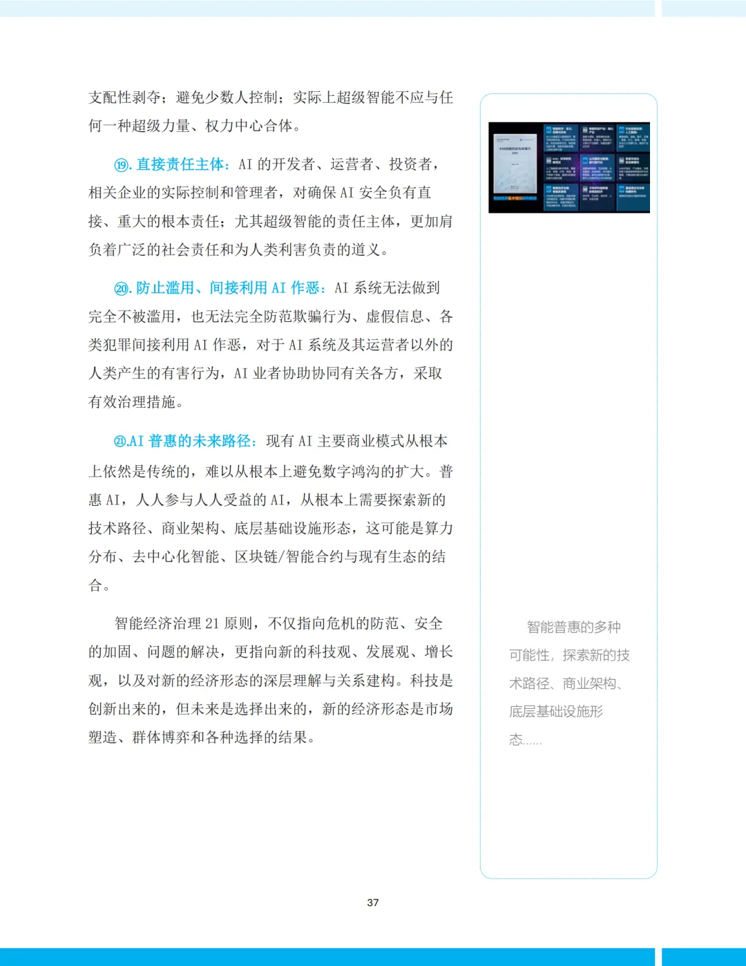 《报告》最后提出《AI发展21原则》,作为智能经济治理的行动框架。其核心思想是:“智能以人类为本”。
