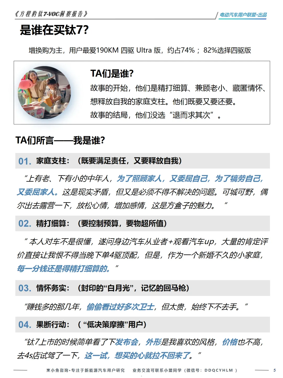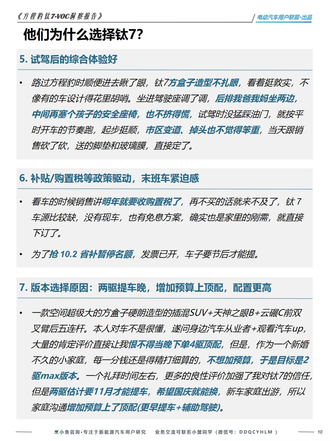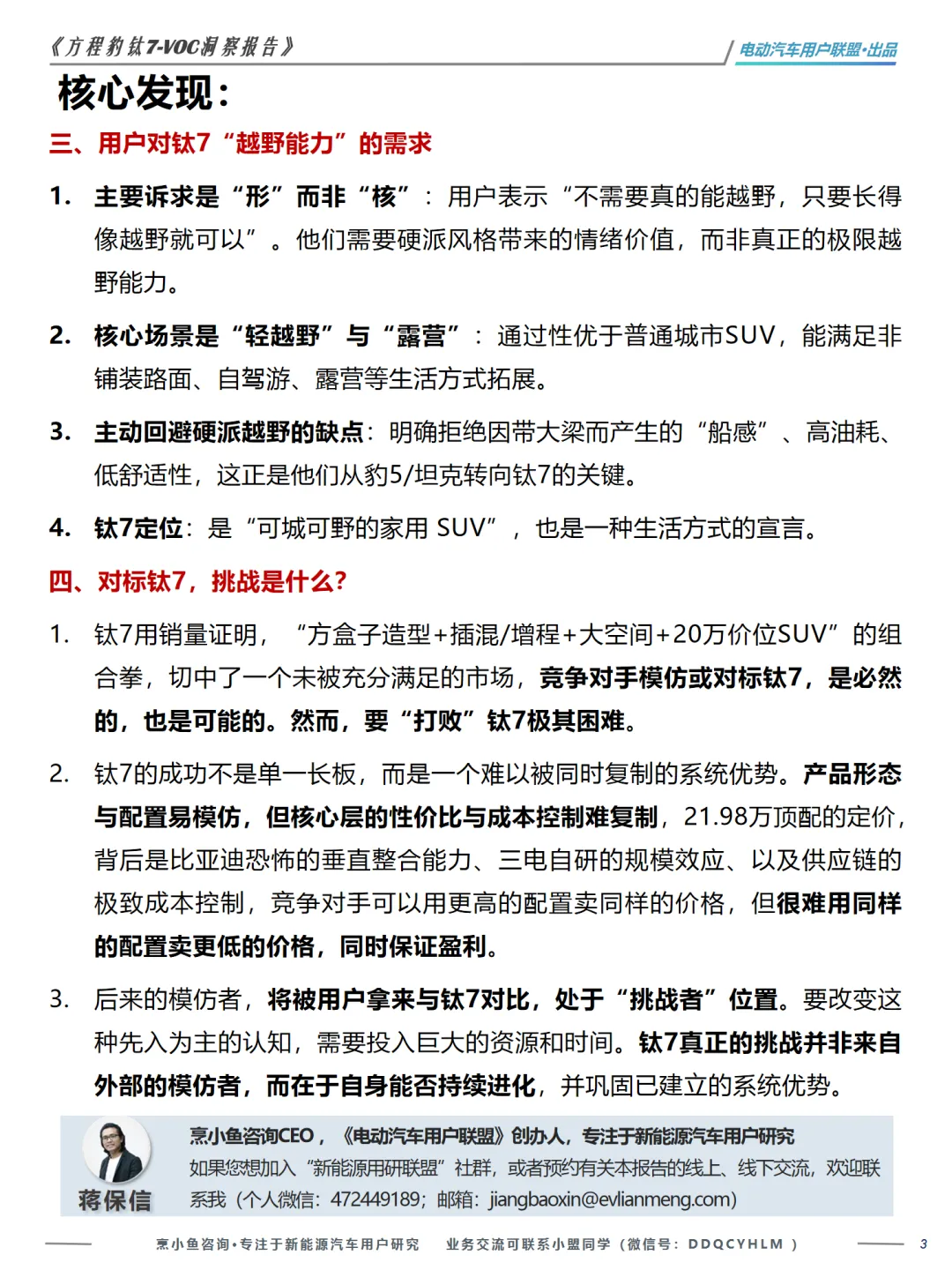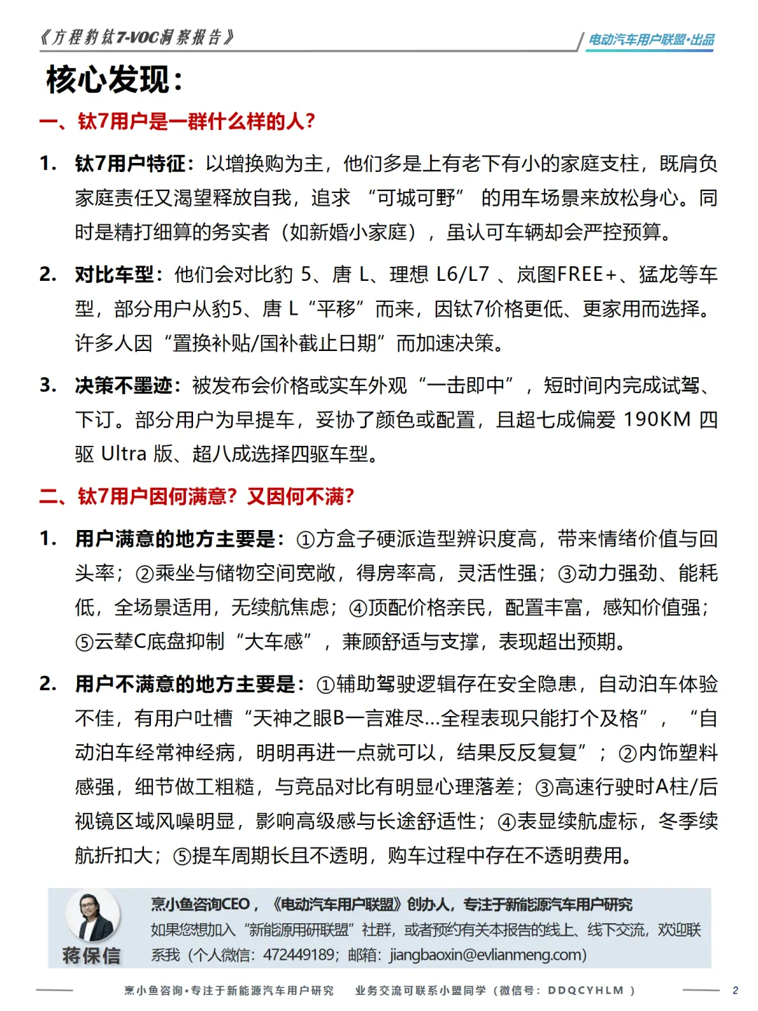 本篇行业报告可以通过扫下方知识星球下载。39元就可以下载星球所有报告。免费提供报告查找服务。在新能源汽车市场日益激烈的竞争中,了解用户的真实需求和满意度显得尤为重要。《方程豹钛7-VOC洞察报告》由电动汽车用户联盟出品,通过对404位车主的真实反馈进行分析,揭示了钛7用户的画像、购车决策因素以及满意度的关键点。报告指出,钛7用户主要是家庭支柱,他们在肩负家庭责任的同时,也追求个性化和实用性。他们在选择钛7时,不仅考虑了车辆的价格和外观,还对比了多款车型,如豹5、唐L等,最终因钛7的性价比和家用属性而选择它。用户对钛7的满意度主要集中在其独特的方盒子硬派造型、宽敞的空间、强劲的动力和低能耗,以及顶配车型的高性价比。然而,用户对钛7的不满也不容忽视。智能辅助驾驶体验不及预期、内饰塑料感强、高速行驶时的风噪问题、表显续航虚标以及提车周期长等问题,都是用户关注的痛点。这些问题不仅影响了用户的驾驶体验,也对品牌形象和信任度构成了挑战。报告还特别指出,钛7用户对“越野能力”的需求更多体现在通过性和生活半径的拓展上,而非极限越野能力。他们需要的是能够在非铺装路面、自驾游、露营等场景中表现出色的车辆,而不是传统的硬派越野车。综上所述,钛7在满足用户对家用SUV的基本需求的同时,也展现了其独特的市场定位。但要持续赢得用户的青睐,厂家需要在提升内饰质感、优化智能驾驶体验、降低风噪以及提高续航准确性等方面下功夫。《方程豹钛7-VOC洞察报告》为新能源汽车制造商提供了宝贵的用户反馈,有助于他们在产品迭代和市场策略上做出更精准的决策。免责声明:以上分享报告为公开合法渠道获得,内容大部分来源于网络,版权归原作者所有,如有侵权,请及时与我们联系,我们将第一时间保障您的权益。推荐内容仅供参考学习,不构成投资建议。