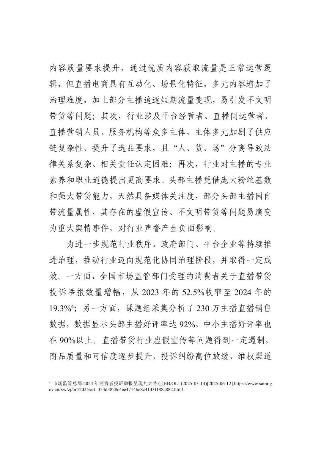 政府部门、平台企业等持续推进治理,推动行业迈向“政府监管、平台治理、行业自律、舆论监督”相结合的规范化协同治理阶段,并已取得积极成效。全国市场监管部门受理的直播带货投诉举报数量增幅显著收窄。数据分析显示,头部主播好评率达92%,中小主播好评率也在90%以上,商品质量和可信度逐步提升,超九成消费者认可直播电商环境改善。
