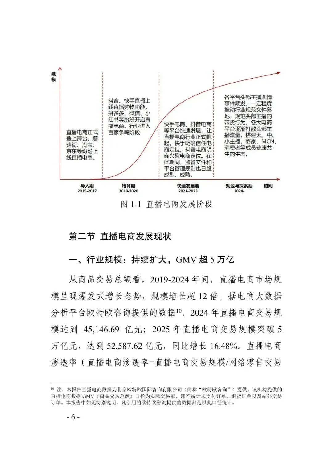《2025直播电商行业发展白皮书》由市场监管总局发展研究中心与中国社会科学院财经战略研究院联合发布,系统梳理了直播电商行业从快速扩张到规范发展的演进路径。报告指出,直播电商已成为我国数字经济领域增长最快、创新最活跃的商业模式之一,在促进消费、扩大就业及推动产业数字化转型方面发挥了关键作用。2025年,行业商品交易总额(GMV)预计超过5万亿元,占网络零售额近三分之一,用户规模预计达6.6亿。