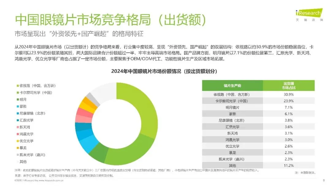 艾瑞测算,2024年中国眼镜零售市场规模约933亿元,其中镜片约4409亿元,占整体眼镜产品市场的44%,2019-2029年镜片零售市场年均复合增长率CAGR勺6%-8%。行业竞争格局呈"国际龙头+国产功能化品牌"并行:依视路、卡尔蔡司等在高端与品牌影响力上仍占优势,汇鼎光学、全真光学、明月镜片等国产品牌石在出货量与细分赛道上快速追赶。