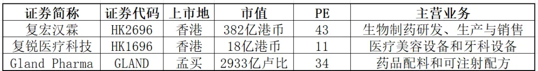 公司分拆了多家子公司在香港上市。2019年复宏汉霖在香港主板上市,成为复星医药分拆上市的重要里程碑,复宏汉霖聚焦单克隆抗体药物研发与商业化。其后几家核心子公司也相继登陆港股。Gland Pharma 是印度第一家获得美国 FDA 批准的注射剂生产企业,生产药品配料和注射配方;复锐医疗科技(Sisram)是首家于联交所主板上市的以色列公司,主要生产医疗美容设备和牙科设备。