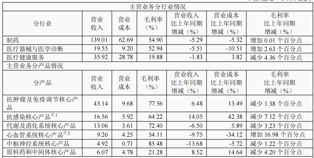 制药板块营收占比最大,主要销售产品包括抗肿瘤及免疫调节产品、抗感染产品、代谢及消化系统产品、心血管系统产品、中枢神经系统产品、原料药和中间体产品等。通过自主研发、合作开发、许可引进、深度孵化等方式丰富创新产品管线,渠道非常多,不过从细分领域毛利率来看,技术含量跟一线的创新药企业相比是有一定差距的。