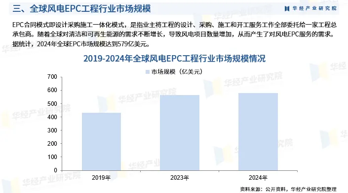 EPC合同模式即设计采购施工一体化模式,是指业主将工程的设计、采购、施工和开工服务工作全部委托给一家工程总承包商。随着全球对清洁和可再生能源的需求不断增长,导致风电项目数量增加,从而产生了对风电EPC服务的需求。据统计,2024年全球EPC市场规模达到579亿美元。