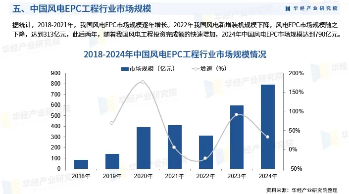 据统计,2018-2021年,我国风电EPC市场规模逐年增长。2022年我国风电新增装机规模下降,风电EPC市场规模随之下降,达到313亿元,此后两年,随着我国风电工程投资完成额的快速增加,2024年中国风电EPC市场规模达到790亿元。