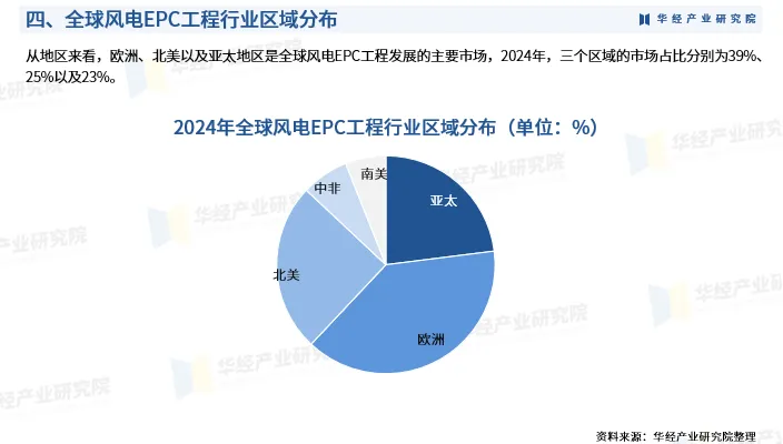 从地区来看,欧洲、北美以及亚太地区是全球风电EPC工程发展的主要市场,2024年,三个区域的市场占比分别为39%、25%以及23%。
