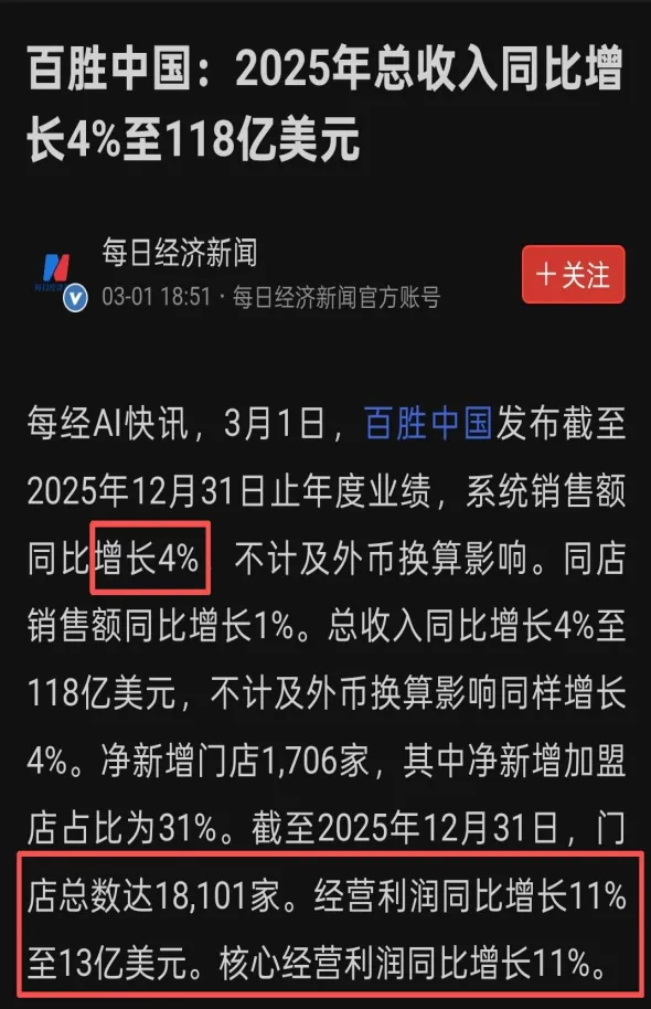 2025年肯德基门店数达12997家,净增1349家,系统销售额同比增长5%,餐厅利润率达17.4%。