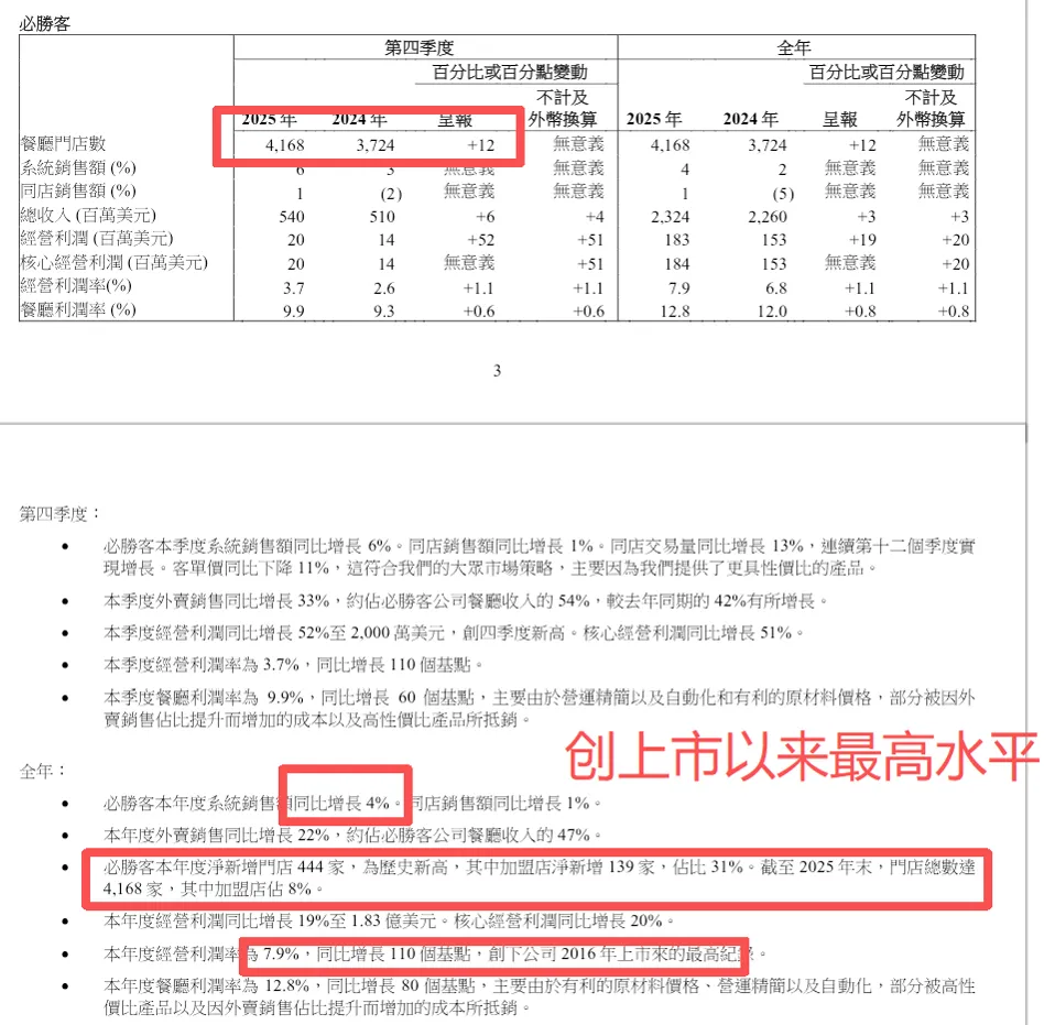 必胜客门店数4168家,净增444家,经营利润率7.9%创2016年上市以来新高,客单价优化至69元,推动第四季度同店交易量同比增长13%。