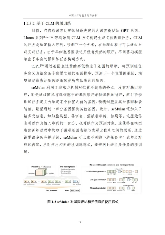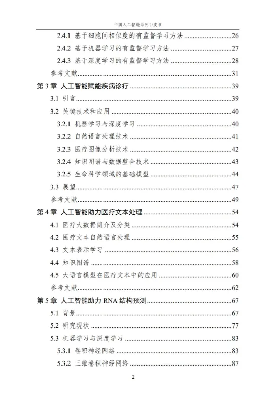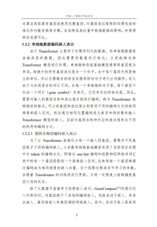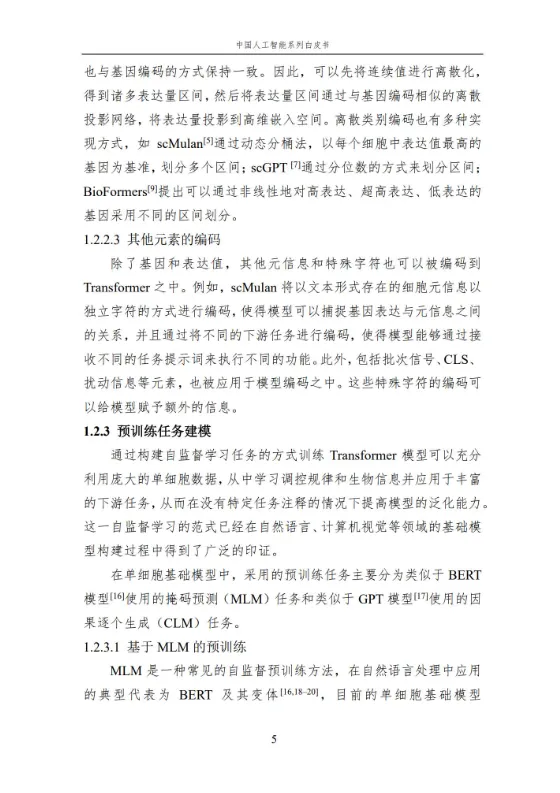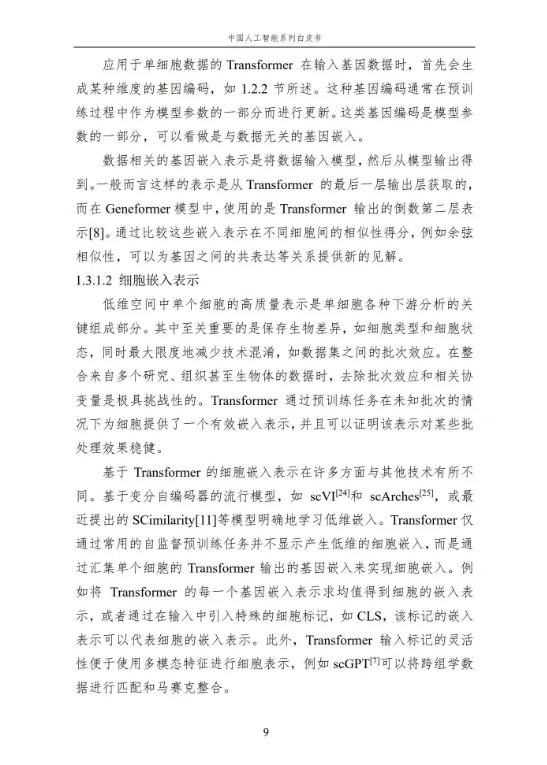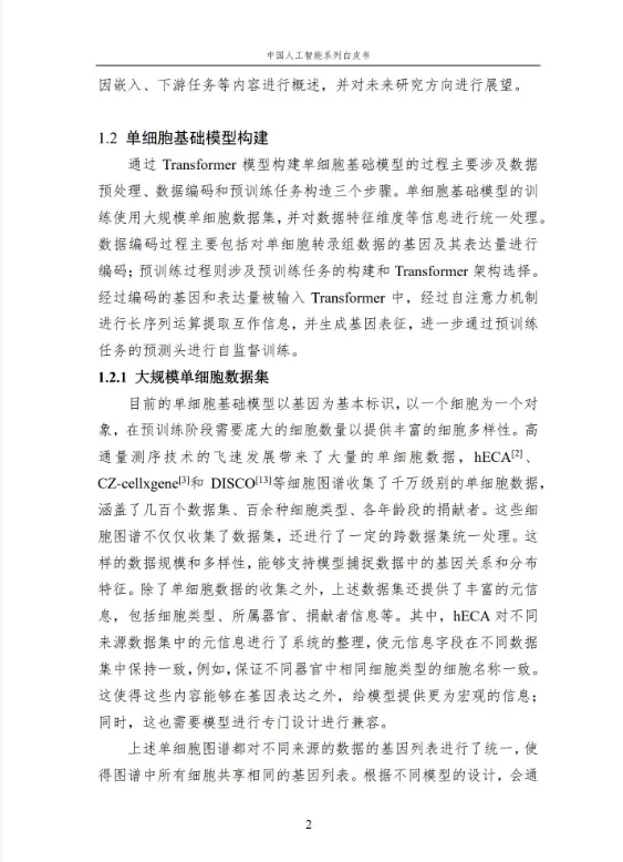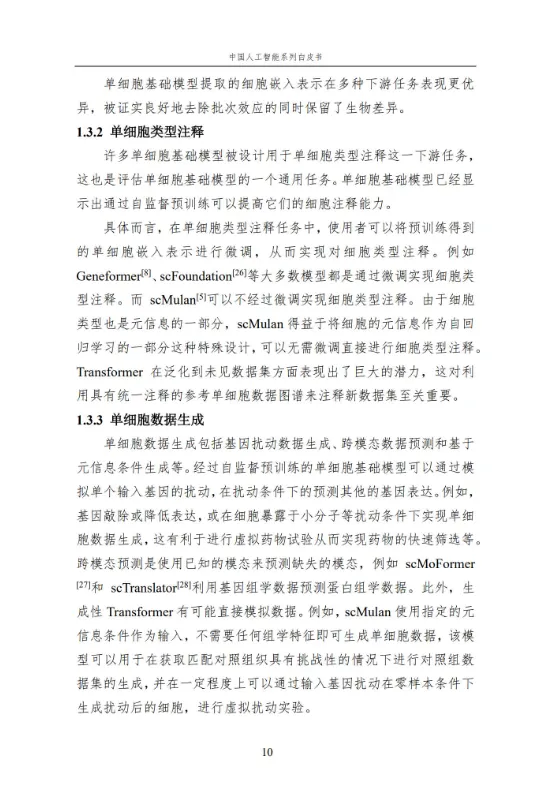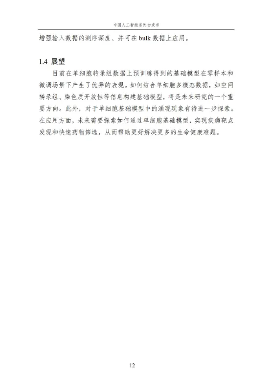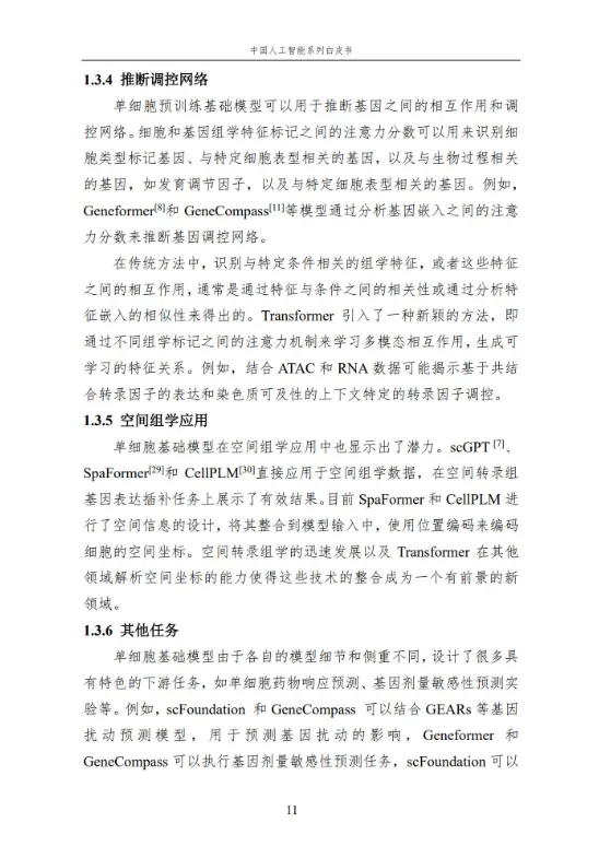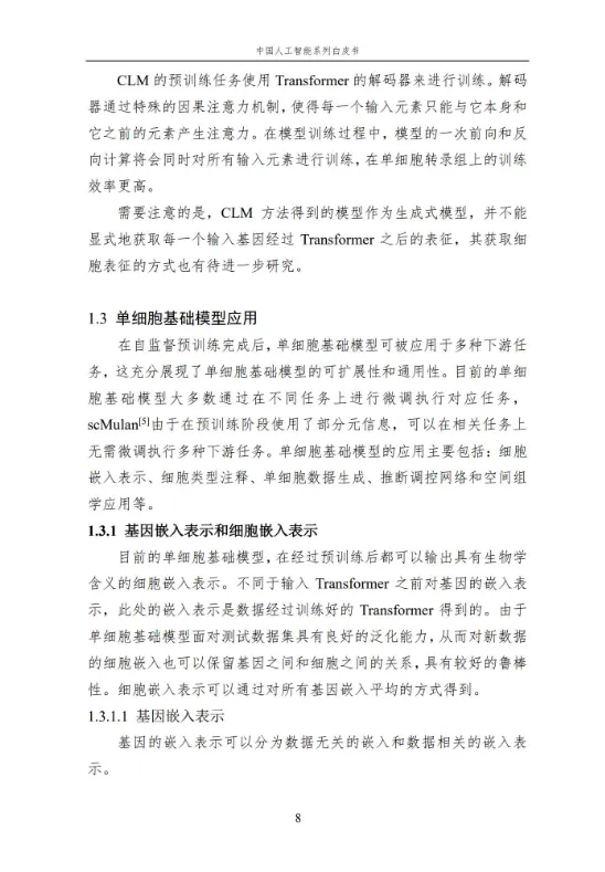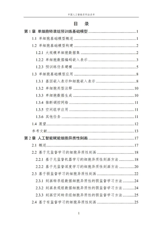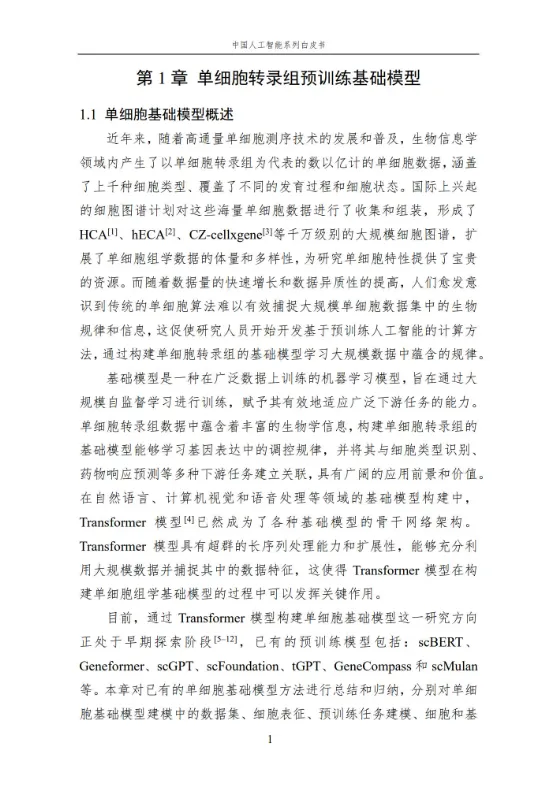 本报告作为中国人工智能系列白皮书的重要组成,聚焦人工智能在生命科学领域的核心应用与前沿进展。报告系统梳理了人工智能技术在单细胞基础模型构建、细胞异质性刻画、疾病诊疗、医疗文本处理、RNA 结构预测等多个方向的应用,涵盖无监督、弱监督、有监督等多种学习方法,详解关键技术原理、代表性模型及实践应用。同时,分析当前技术应用的优势与挑战,展望未来发展方向,为相关领域研究人员、从业者提供全面的参考,助力推动人工智能与生命科学的深度融合,赋能生命健康领域的创新发展。