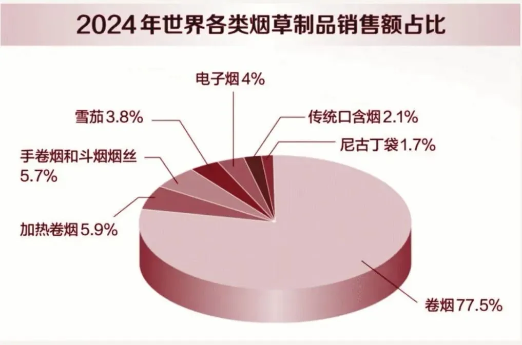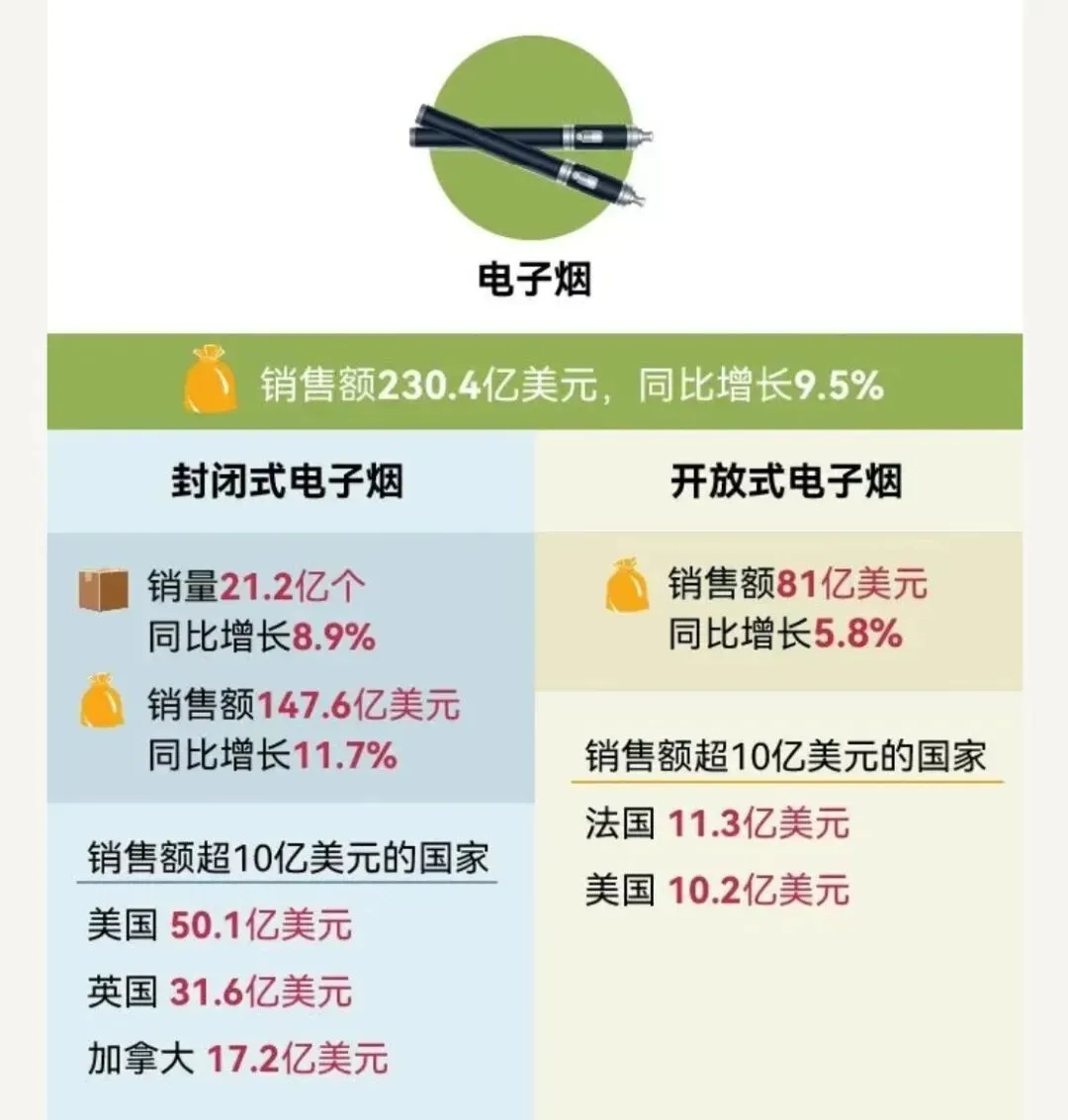 2024年,全球电子烟销售额230.4亿美元,同比增长9.5%,占除中国市场外全球烟草制品总销售额的4%。