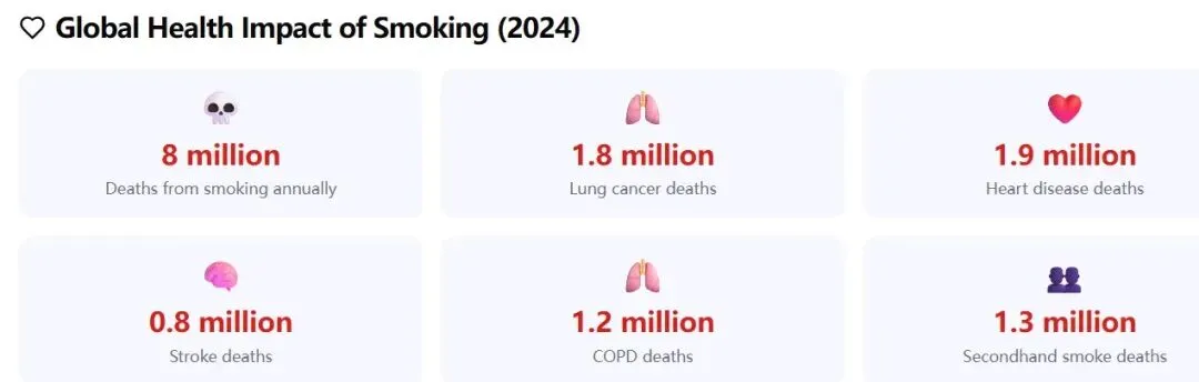 明确导致肺癌、心血管疾病、呼吸系统疾病等多种致命疾病,是全球可预防死亡的首要原因。