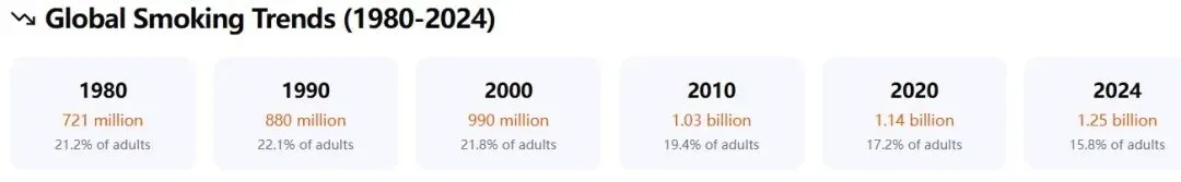 - 2019年数据:全球约13.5亿人使用烟草产品,年消费5.2万亿支香烟,市场规模达8654亿美元。