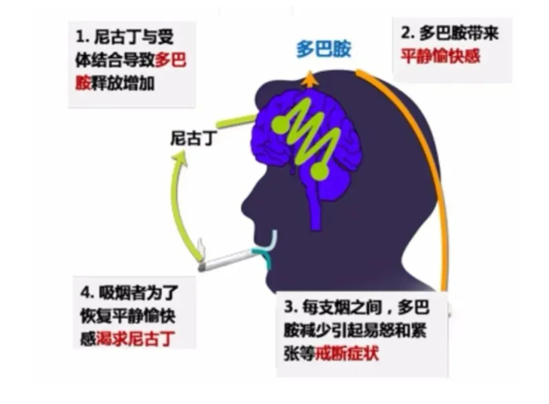 烟草中的尼古丁进入血液后,与神经系统中的乙酰胆碱受体结合,促使大脑分泌多巴胺。