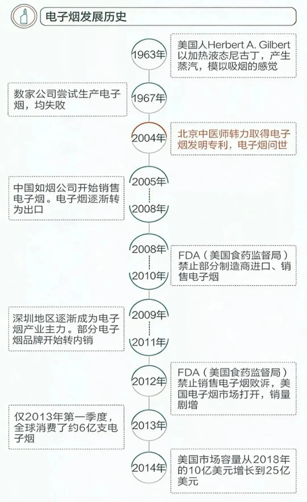 电子烟于2003年由中国药剂师韩力研发,最初品牌名为“如烟”。韩力因目睹父亲患癌去世,自身戒烟又受困于戒断反应,遂研发电子烟作为戒烟工具。2004年如烟科技公司成立,产品推向市场并大获成功。