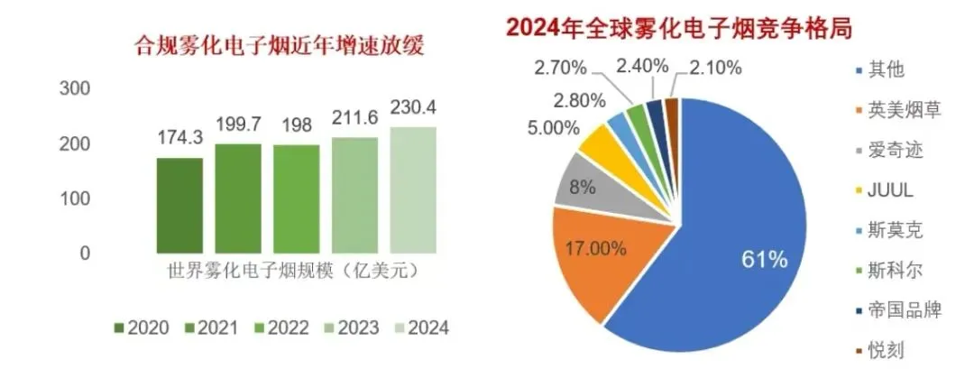 2025年,受统计口径差异影响,市场预计规模在232.5亿至600亿美元之间。行业整体增速放缓至个位数,标志着电子烟市场进入成熟期。