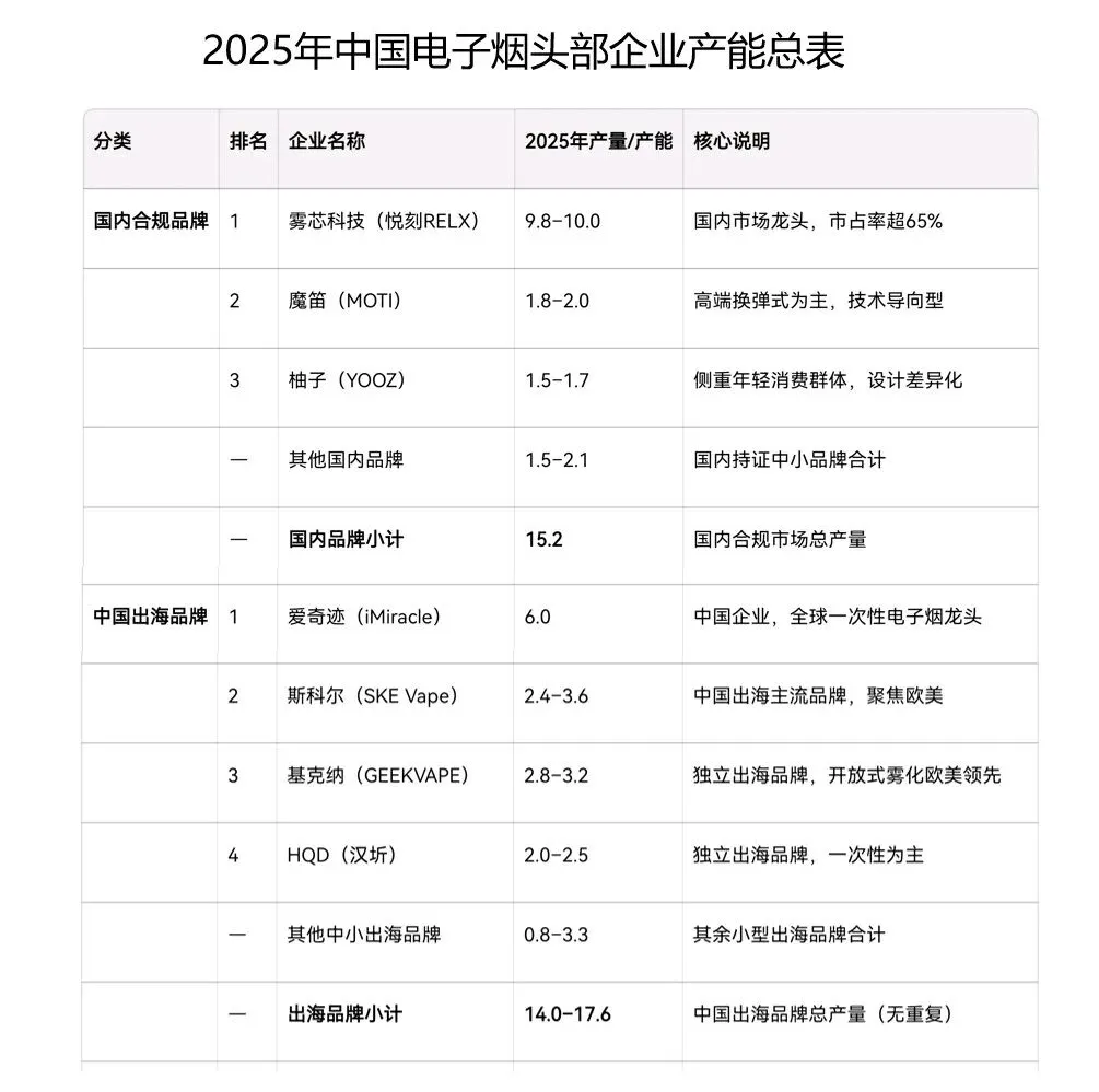 - 国内产能:只算整机产能,烟弹/一次性不算整机产能