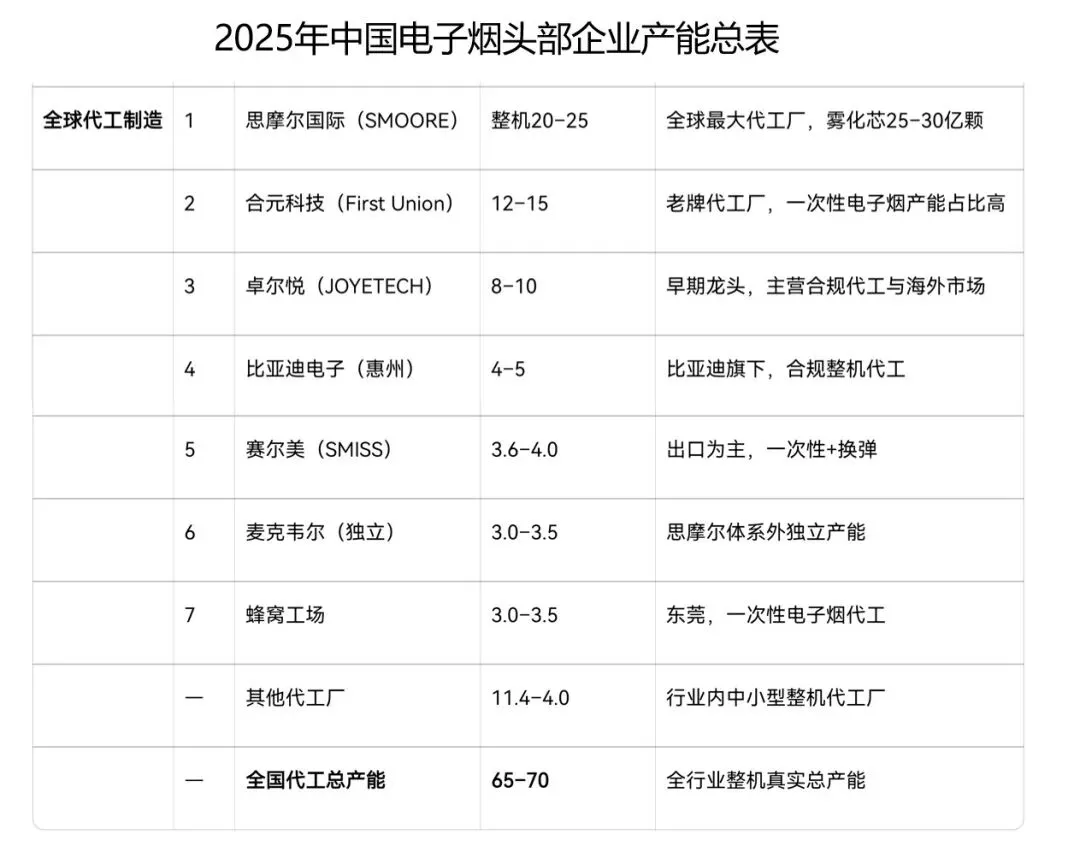 行业调研口径的中国大陆头部代工厂整机产能约 70 亿支;