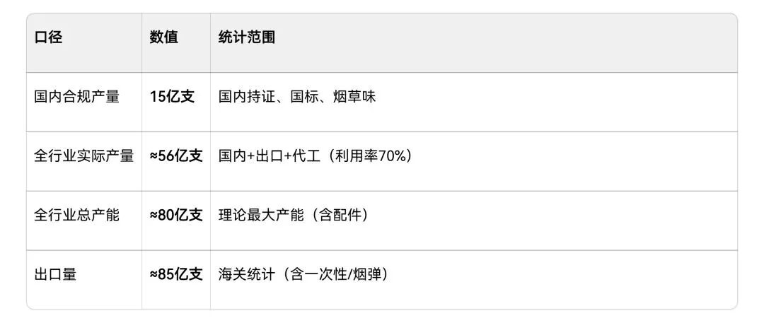 中国全行业真实总产能(含一次性整机:65–70、烟弹35–40、小厂、配件25–30)约 120–140 亿支;