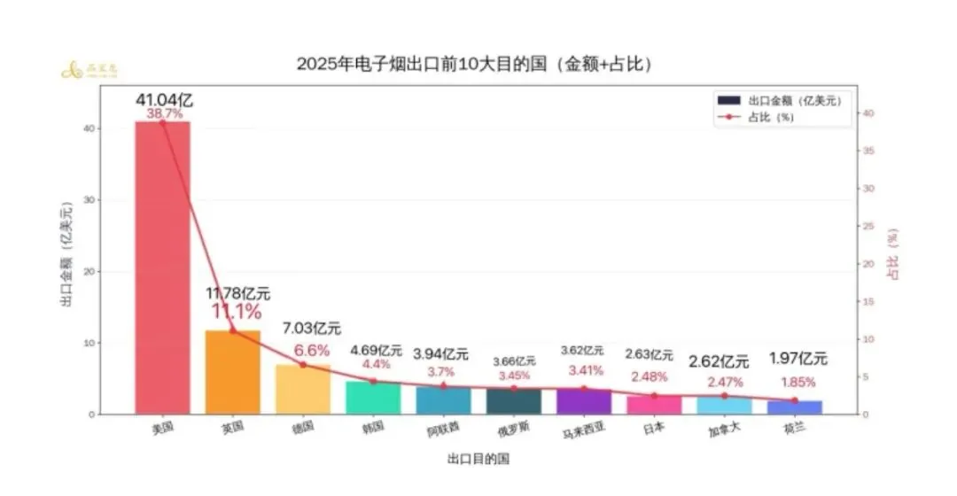 2024年,中国电子烟总出口额约109.6亿美元,出口排名前十的目的国依次为:美国、英国?德国……