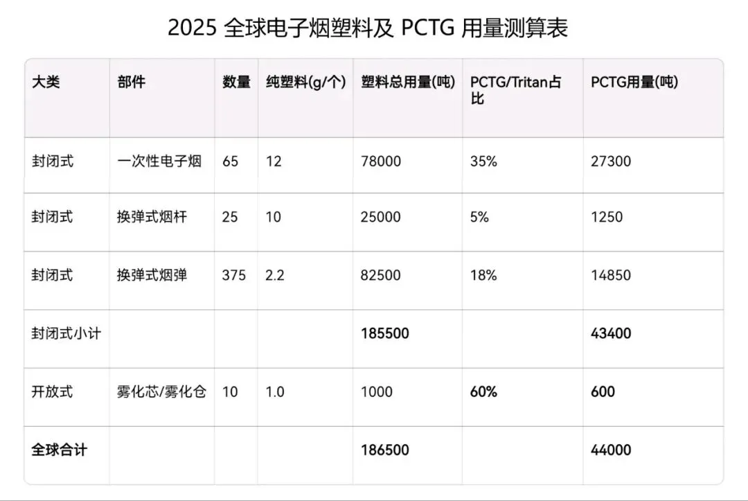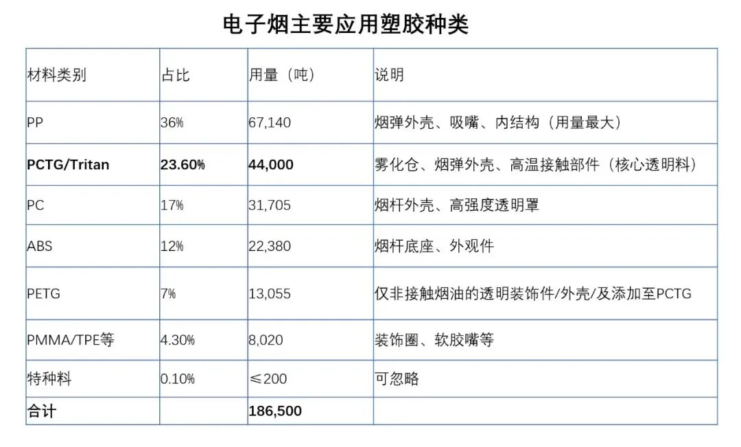 材料以 PP、PC、ABS、PETG、PMMA 为主,PCTG(Tritan) 仅用于雾化仓与部分高端烟嘴,整体用量约 4.4 万吨,占电子烟塑料总量约 23.6%。