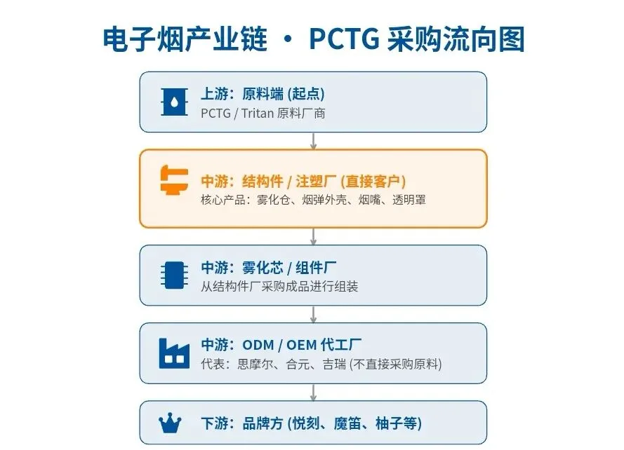 不要直接找悦刻、思摩尔,要找深圳/东莞的雾化仓/烟嘴注塑厂、结构件厂、配件代工厂——它们才是PCTG的直接采购方,占4.4万吨用量的90%以上。