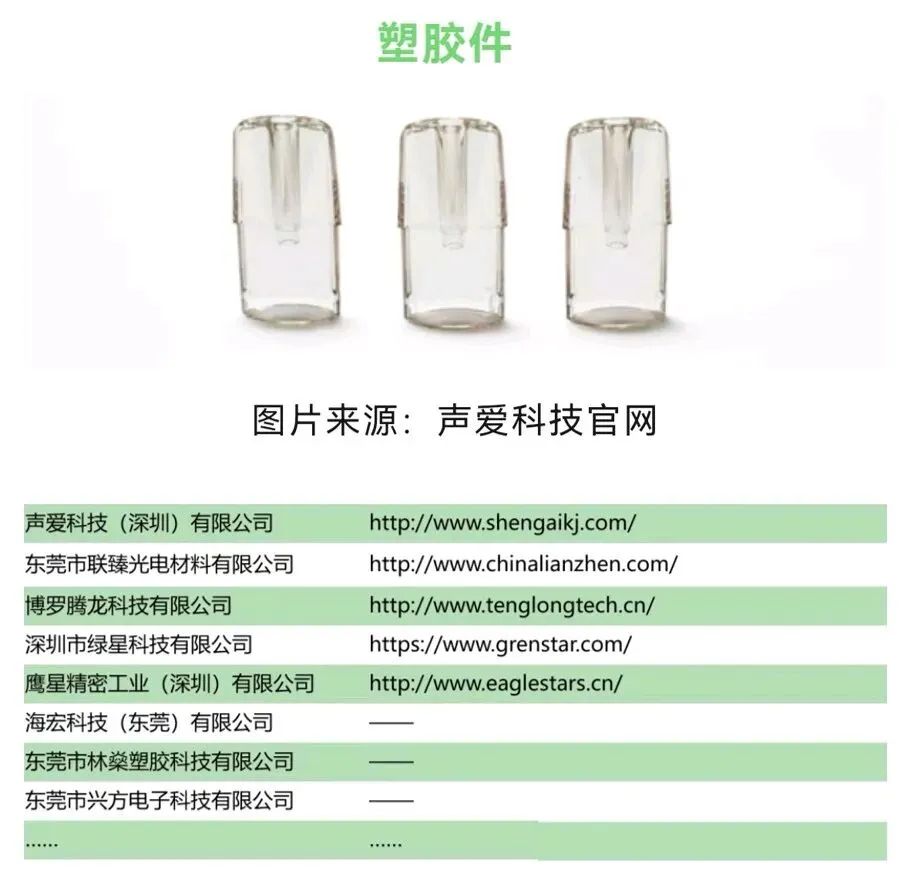 - 结构件/注塑厂(核心):深圳、东莞、惠州,做雾化仓、烟弹外壳、烟嘴、透明罩(PCTG 100%用量)