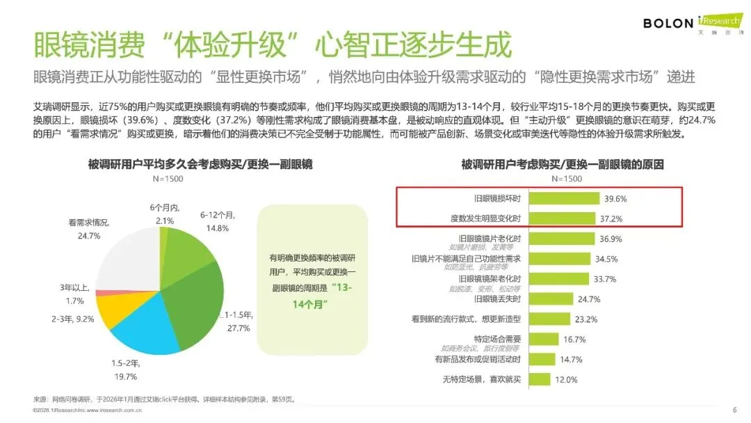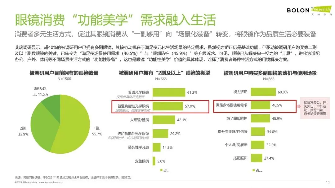 眼镜业正经历一场“去医疗化”的价值跃迁,从解决视力问题的“工具”进化为定义个人审美的“面部珠宝”。数据显示,89.1%的消费者有视力矫正需求,但仅62.5%的人仍将眼镜视为“医疗工具”。52.3%的消费者将其看作“提升自信的日常必需品”,44.2%视其为“彰显品味的标志”。更换周期已缩短至13-14个月,低于行业平均的15-18个月;近半数消费者拥有多副眼镜,用于适配办公、户外等不同场景。