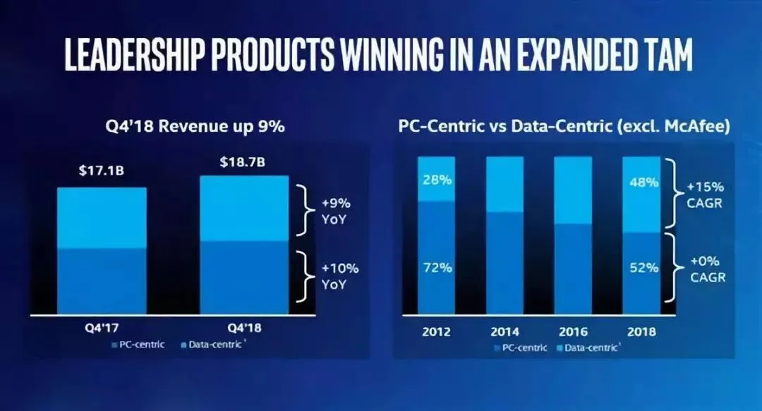 2018年第四季度,Intel取得收入186.57亿美元(约合人民币1265亿),同比增长9%;运营利润66亿美元,同比增长10%;净利润51.95亿美元(约合人民币亿350元),而上年同期因为税率(111.4%)影响亏损6.87亿美元;每股收益1.12美元,去年同期为亏损0.15美元。