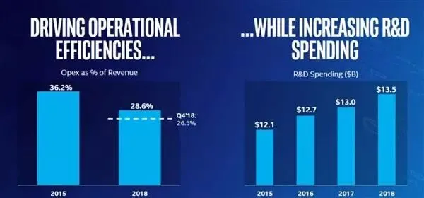 2018年,Intel研发投入达135亿美元,连年保持增长势头,相比2015年已经增加了11.6%。