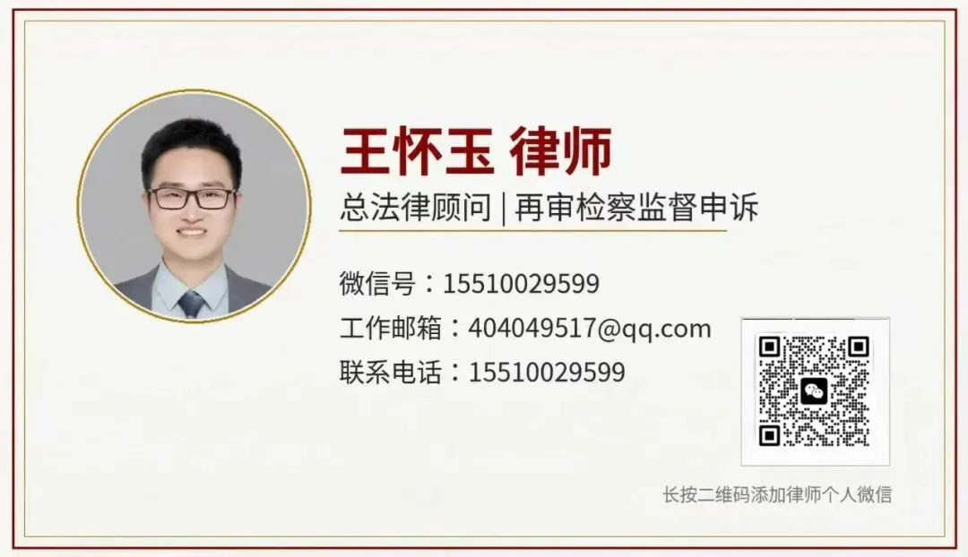 如果您也喜欢本文,建议收藏、转发,帮助更多朋友了解翻案知识。我是王怀玉律师,专注于再审、检察监督、申诉翻案的法律实务;如果您正在寻找翻案突破口,欢迎和我交流,我可以为您提供“公益阅卷+诊断+再审、抗诉方案”定制服务。——带你看懂判决、抓准错点、量身打造再审申请书、检察监督申请书!