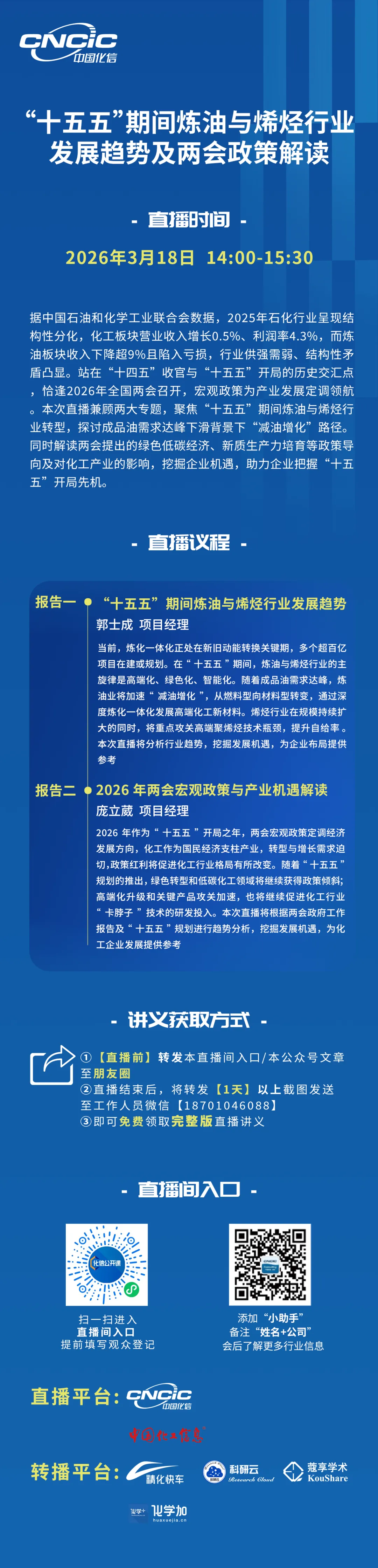 据中国石油和化学工业联合会数据,2025年石化行业呈现结构性分化,化工板块营业收入增长0.5%、利润率4.3%,而炼油板块收入下降超9%且陷入亏损,行业供强需弱、结构性矛盾凸显。站在“十四五”收官与“十五五”开局的历史交汇点,恰逢2026年全国两会召开,宏观政策为产业发展定调领航。本次直播兼顾两大专题,聚焦“十五五”期间炼油与烯烃行业转型,探讨成品油需求达峰下滑背景下“减油增化”路径,以及高端新材料的发展机遇展开深度探讨。同时解读两会提出的绿色低碳经济、新质生产力培育等政策导向及对化工产业影响,挖掘企业机遇,助力企业把握“十五五”开局先机。