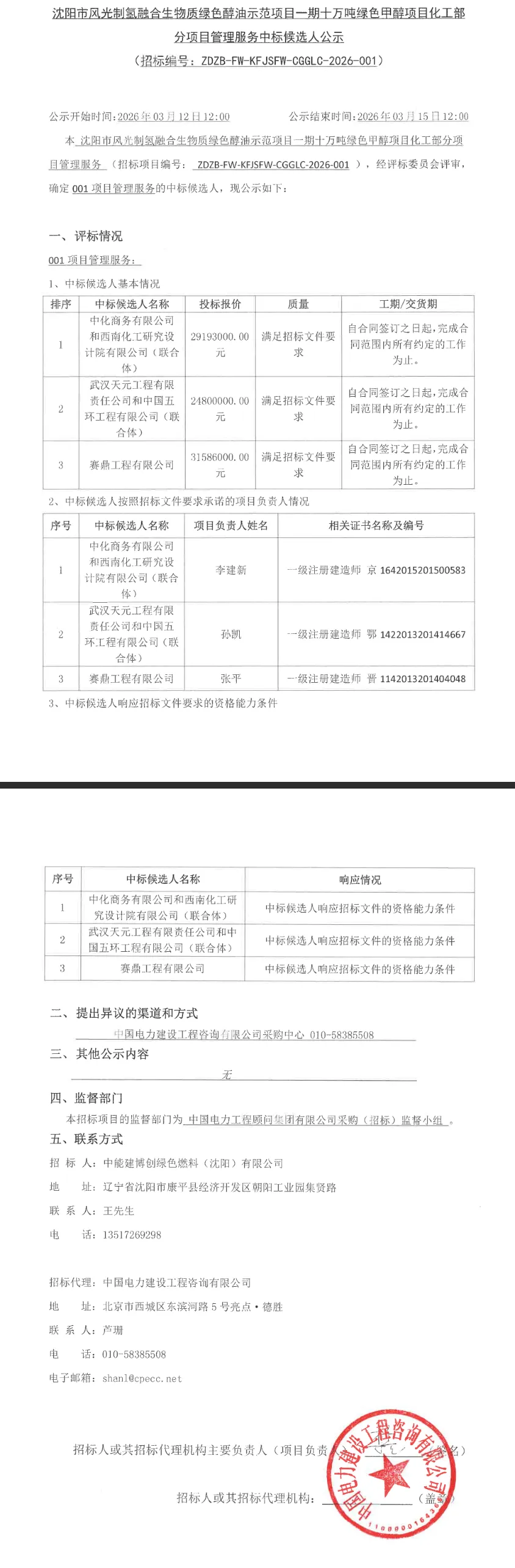 2026年3月12日,沈阳市风光制氢融合生物质绿色醇油示范项目一期十万吨绿色甲醇项目化工部分项目管理服务中标候选人公示。