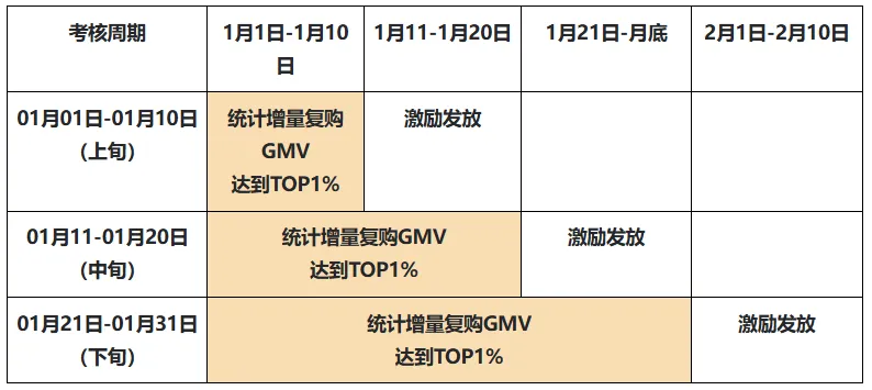 每个周期结束统计增量复购GMV,进入同行TOP1%获得下一周激励;