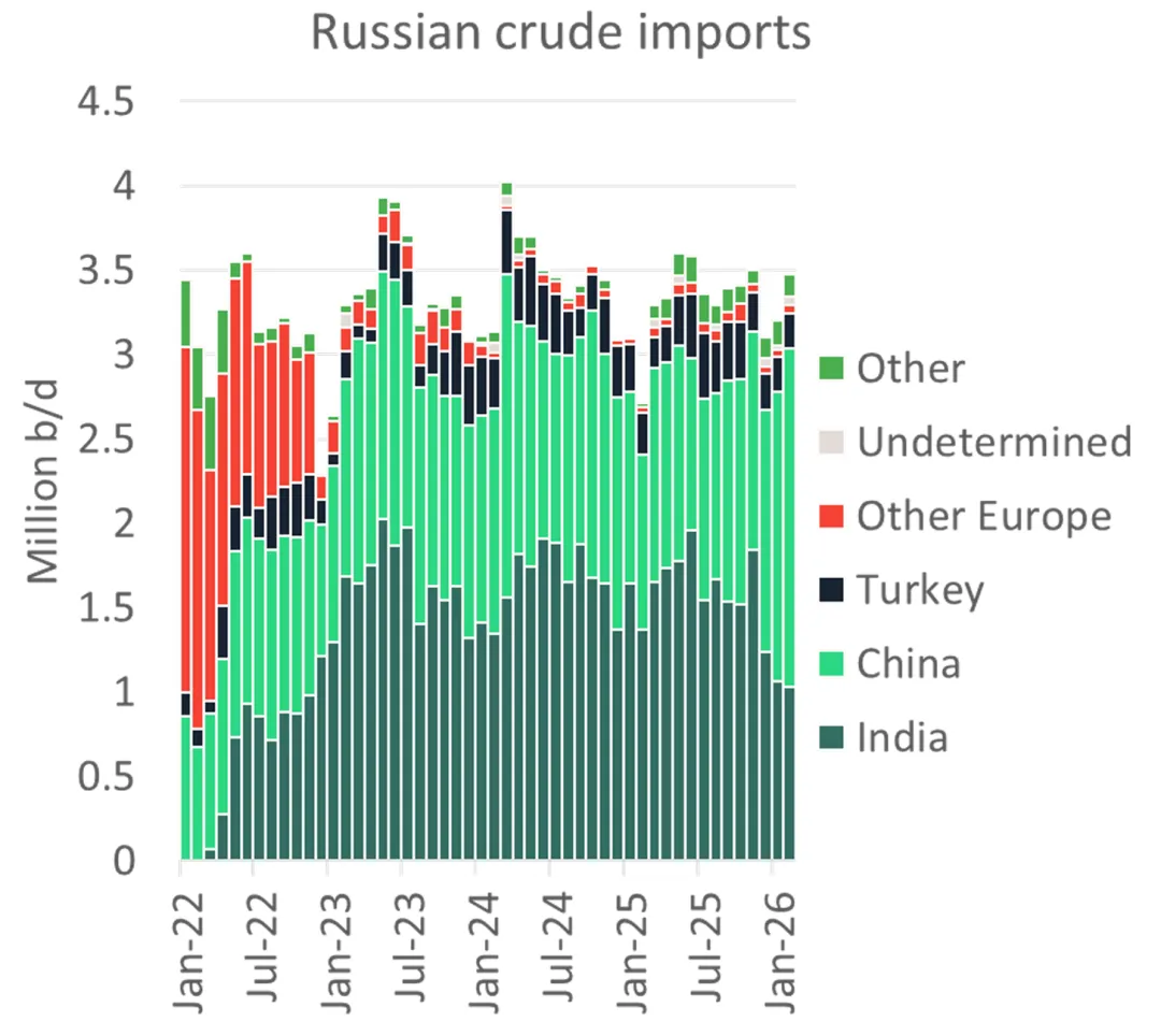 目前在途的4,900万桶俄罗斯原油,这些原油均在3月5日之前装船,系统预测目的地为东亚。其中约2,500万桶在俄罗斯西部港口装载,目前尚未经过印度,因此很可能在印度卸货。剩余约2,400万桶俄罗斯原油要么已经在前往东亚途中经过印度,要么是在3月5日之前在俄罗斯远东港口装船,但尚未卸货。