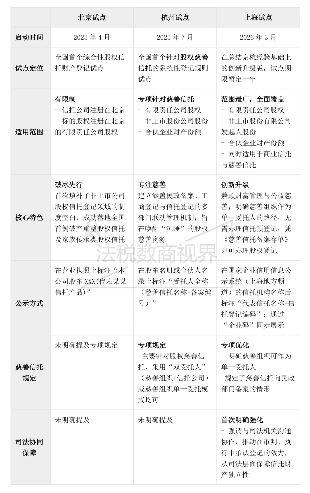 截至2026年3月12日,全国范围内已公开启动的股权信托财产登记试点主要集中在三个城市,分别是北京、杭州和上海。这三个城市的试点各有侧重,共同构成了当前股权信托登记制度探索的主要版图。