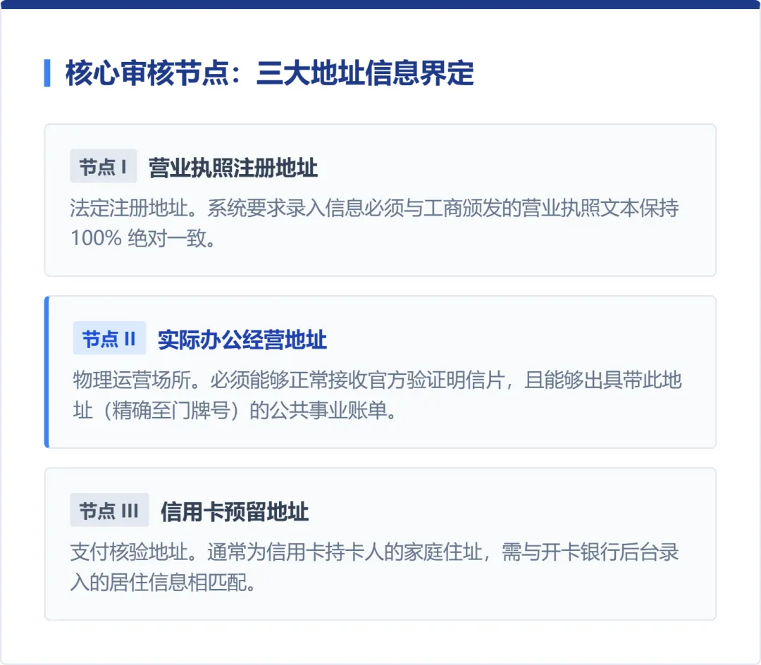 当平台发起地址验证(邮寄明信片)或触发实质性二审(要求提供账单)时,虚拟地址的脆弱性便暴露无遗。这类缺乏前台签收服务、更无法向单一租户提供独立公共事业账单的地址,将直接导致审核链条断裂。因此,我们强烈建议:在“实际办公地址”一栏,务必录入具备真实业务轨迹、能获取独立公用事业账单的物理地址。