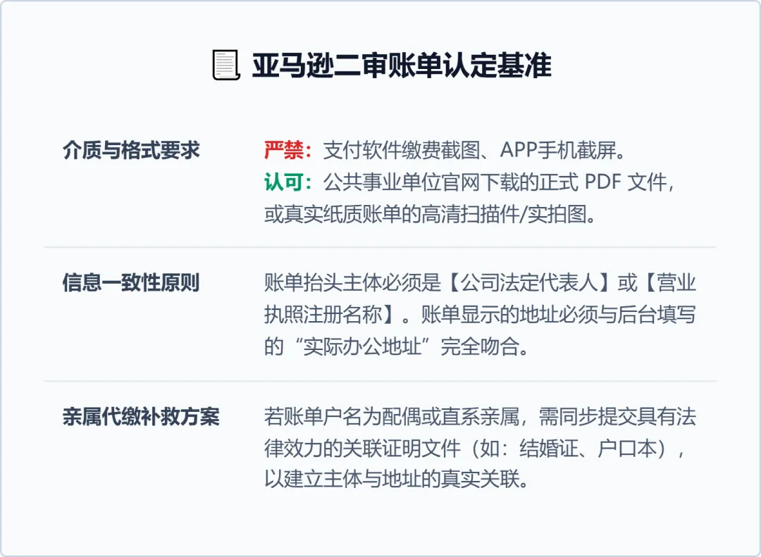 在关联性方面,账单的抬头必须是公司法定代表人或营业执照上的企业名称。如果办公场所的账单开在配偶或父母名下,卖家需同时提交结婚证、户口本等法定文件,以构筑完整的证据链闭环,向系统证明物理地址与运营主体的真实关联。