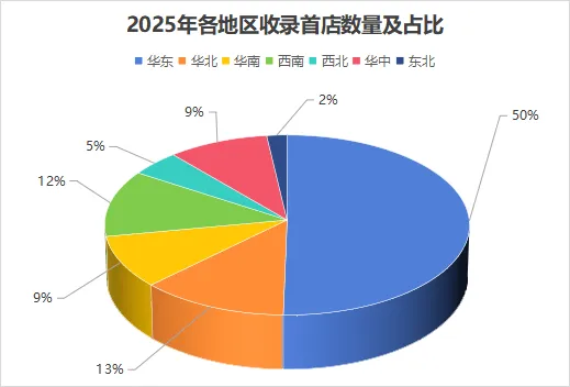 2025 年全国首店区域分布的马太效应依旧显著,华东区域以1939 家首店占据全国50%的份额,成为绝对的领头羊,形成以上海为核心、长三角城市协同承接的格局。
