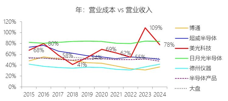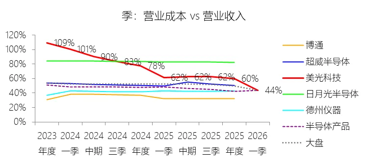 营业成本:2026财年第一季,美光科技的营业成本为59.97亿美元,同比增长11.86%,与营业收入的比例为43.96%(营业成本率,即1-毛利率),同比下降17.6个百分点;2015-2024财年(十年),此项合计为1434.40亿美元,平均比例为64.25%,比半导体产品行业的均值高13.64个百分点,长期呈上升趋势。