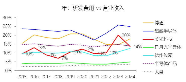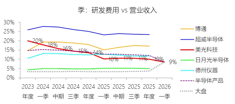 研发费用:2026财年第一季,美光科技的研发费用为11.71亿美元,同比增长31.87%,与营业收入的比例为8.58%(研发费用率),同比下降1.61个百分点;2015-2024财年(十年),此项合计为244.86亿美元,平均比例为10.97%,比半导体产品行业的均值低3.33个百分点,长期呈上升趋势。
