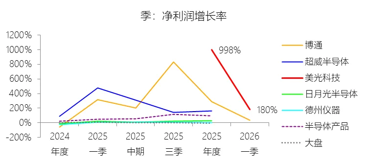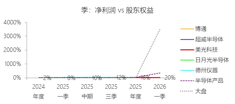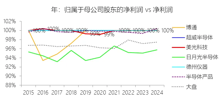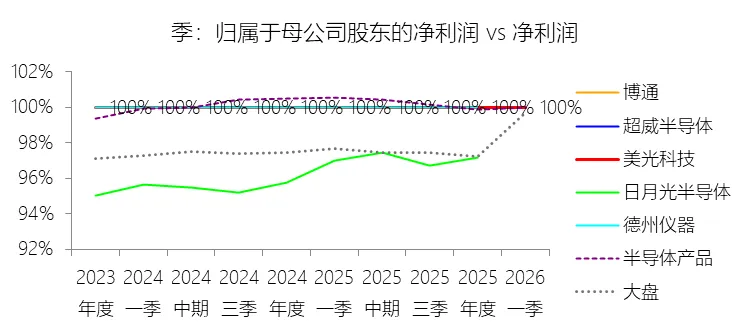 归属于母公司股东的净利润:2026财年第一季,美光科技的归属于母公司股东的净利润为52.40亿美元,同比增长180.21%,与净利润的比例为100.00%,同比持平;2015-2024财年(十年),此项合计为403.40亿美元,平均比例为99.82%,比半导体产品行业的均值低0.02个百分点,长期呈下降趋势。