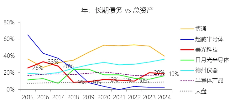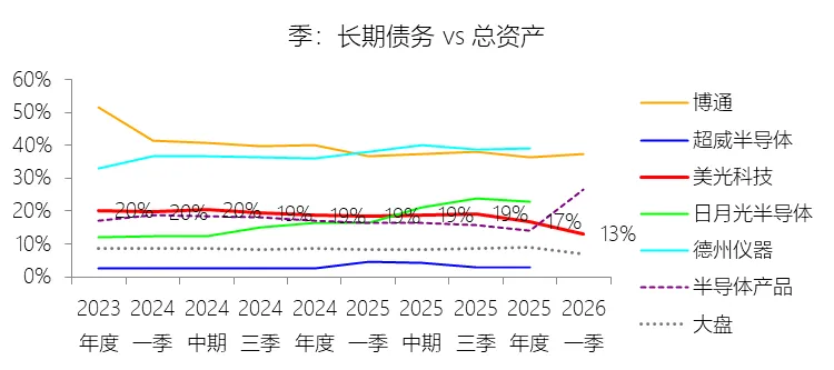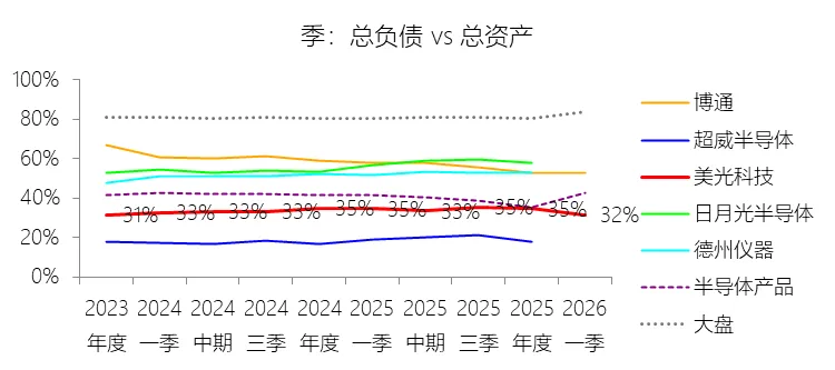 长期债务:2026财年第一季末,美光科技的长期债务为111.87亿美元,对比年初减少20.19%,与总资产的比例为13.01%,同比下降5.53个百分点;2015-2024财年(十年),此项合计为794.11亿美元,平均比例为16.15%,比半导体产品行业的均值低1.97个百分点,长期呈下降趋势。