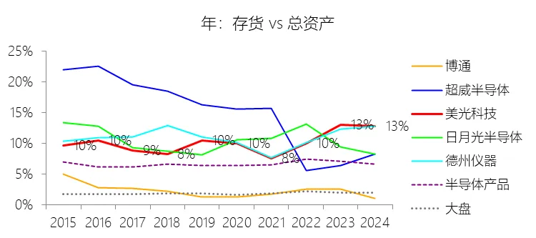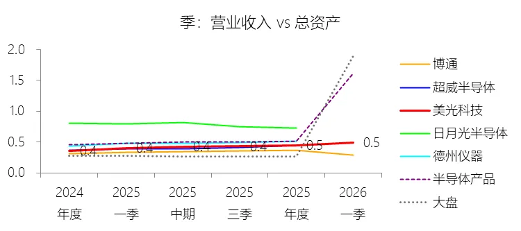总资产周转率:2026财年Q1 TTM,美光科技的总资产周转率为0.5次,同比上升0.09次;2015-2024财年(十年),平均总资产周转率为0.5次,比半导体产品行业的均值低0.04次,长期呈下降趋势。