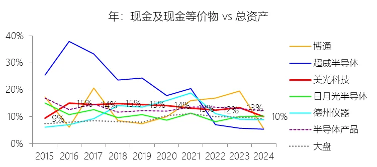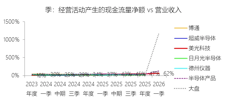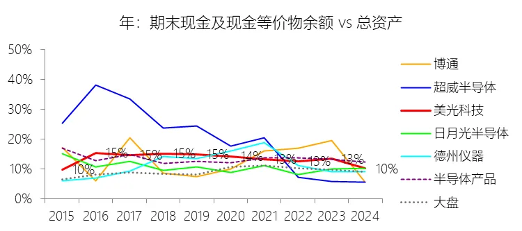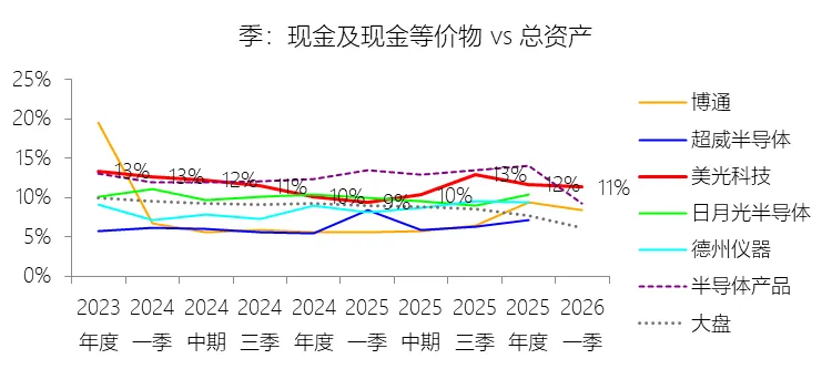 期末现金及现金等价物余额:2026财年第一季末,美光科技的期末现金及现金等价物余额为97.32亿美元,对比年初增长0.89%,与总资产的比例为11.32%,同比上升1.95个百分点;2015-2024财年(十年),此项合计为652.86亿美元,平均比例为13.28%,比半导体产品行业的均值高0.02个百分点,长期呈下降趋势。