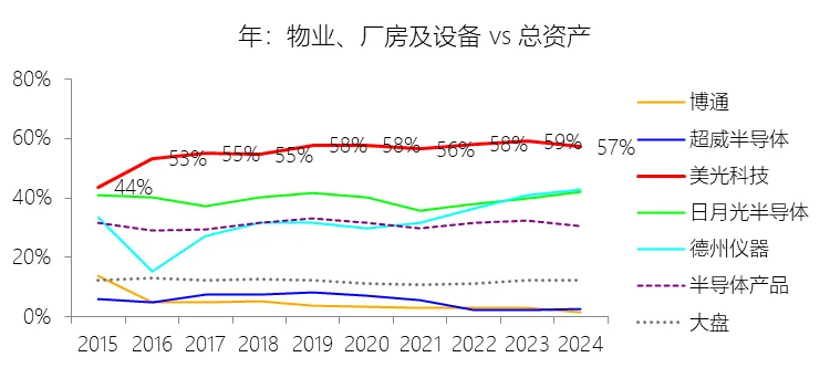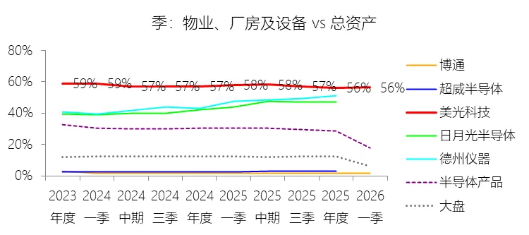 物业、厂房及设备:2026财年第一季末,美光科技的物业、厂房及设备为484.77亿美元,对比年初增长4.05%,与总资产的比例为56.39%,同比下降1.65个百分点;2015-2024财年(十年),此项合计为2770.53亿美元,平均比例为56.34%,比半导体产品行业的均值高25.15个百分点,长期呈上升趋势。