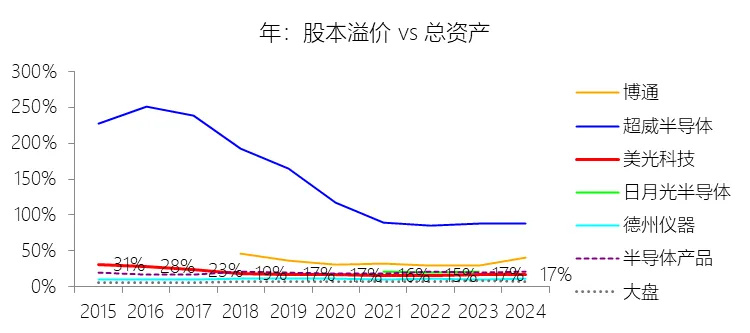 股本溢价:2026财年第一季末,美光科技的股本溢价为136.10亿美元,对比年初增长2.03%,与总资产的比例为15.83%,同比下降1.41个百分点;2015-2024财年(十年),此项合计为916.30亿美元,平均比例为18.63%,比半导体产品行业的均值低1.01个百分点,长期呈下降趋势。