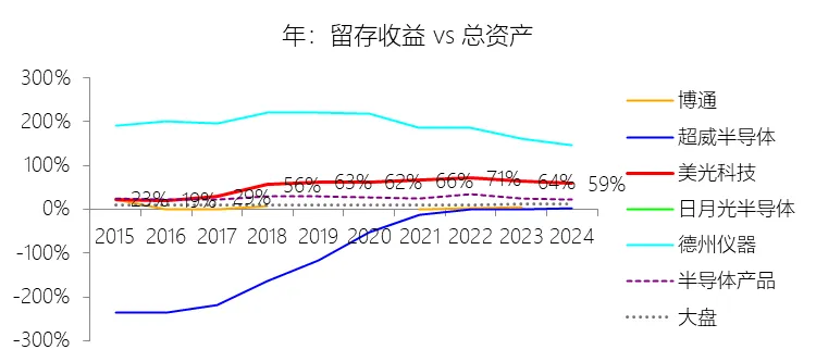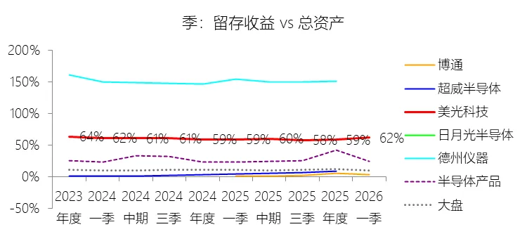 留存收益:2026财年第一季末,美光科技的留存收益为533.44亿美元,对比年初增长9.8%,与总资产的比例为62.05%,同比上升2.68个百分点;2015-2024财年(十年),此项合计为2777.13亿美元,平均比例为56.47%,比半导体产品行业的均值高30.18个百分点,长期呈上升趋势。