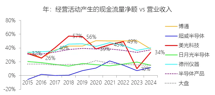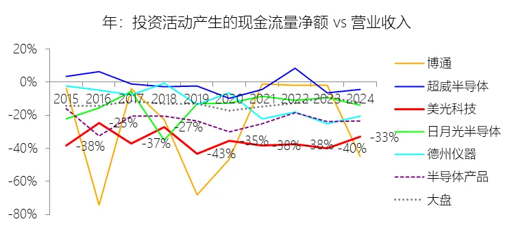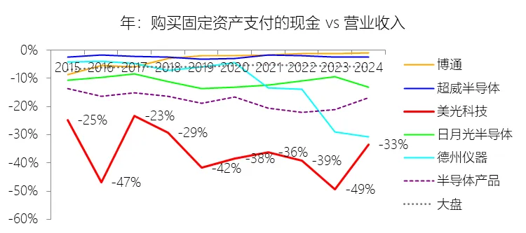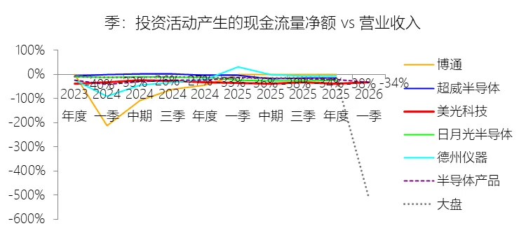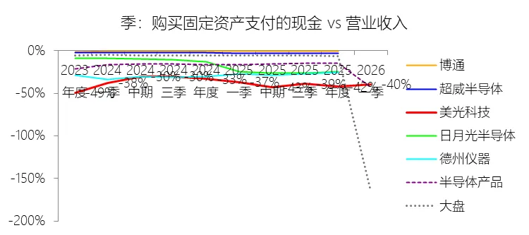 购买固定资产支付的现金:2026财年第一季,美光科技的购买固定资产支付的现金为-53.89亿美元,绝对值同比增长68.09%,与营业收入的比例为-39.50%,同比下降2.69个百分点;2015-2024财年(十年),此项合计为-796.13亿美元,平均比例为-35.66%,比半导体产品行业的均值低17.42个百分点,长期呈下降趋势。